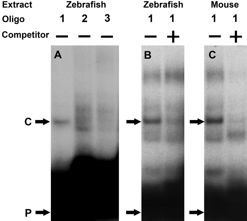 Fig. 5 Electrophoretic mobility shift assay (EMSA) demonstrating a cis-regulatory element in the proximal promoter region. A: Oligonucleotides (1, 2, 3) harboring the -98/-19-bp proximal promoter region were tested with zebrafish embryo extract. B,C: The specificity of the DNA-protein complex was further analyzed using zebrafish embryos and mouse lens nuclear extract in the presence of non-radioactive competitive probes. The probes and specific DNA-protein complexes are, respectively, indicated by the letters P and C. The precise sequences of these oligonucleotides are marked in Figure 6A.
