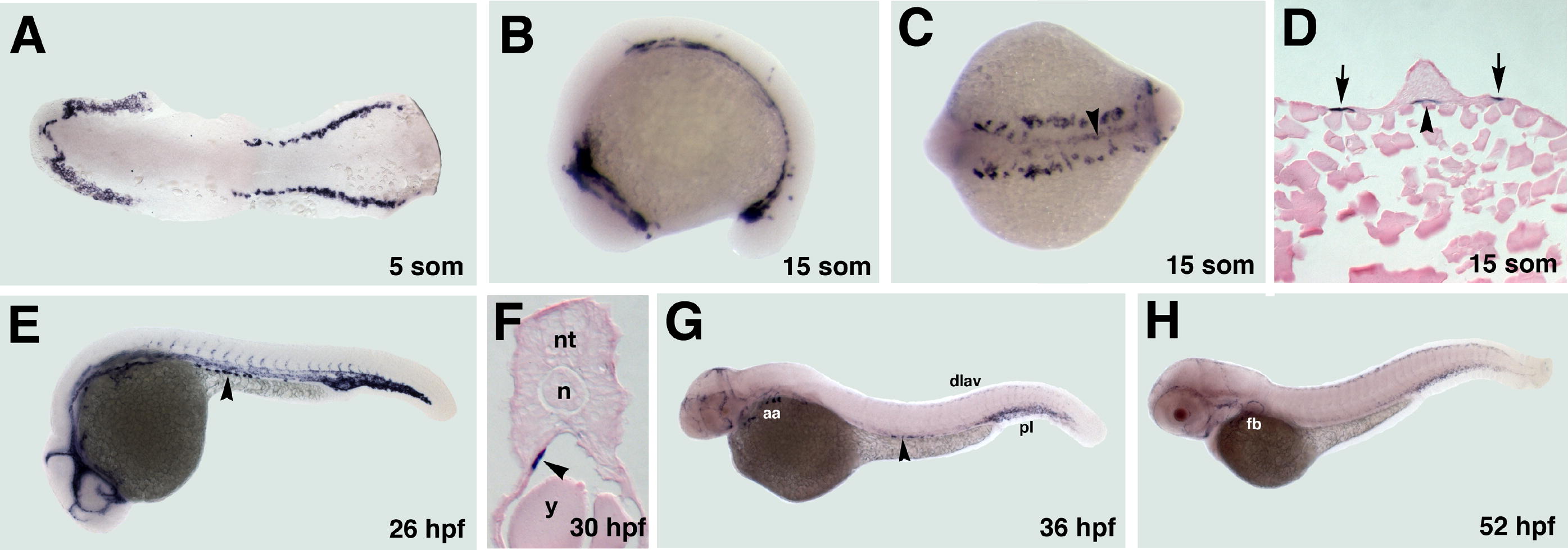 Fig. 2 Expression Pattern of etsrp as Analyzed by In Situ Hybridization Anterior is to the left except as noted. (A) five-somite stage. etsrp is expressed within lateral mesoderm in two distinct expression domains, in the anterior and posterior parts of an embryo. (B) 15-somite stage, lateral view. (C) dorsal view. (D) transverse section. etsrp is expressed in two bilateral stripes of presumptive angioblasts within the lateral mesoderm in the anterior and the trunk and posterior parts of an embryo (arrows, D). In addition, a stripe of etsrp-expressing cells is apparent at the midline and extends through the middle and posterior parts of an embryo (arrowhead, C and D). (E) 26 hpf stage. etsrp is expressed in vascular endothelial cells of the axial, head, and intersomitic vessels. Note a group of etsrp-expressing cells bilaterally located in the intermediate mesoderm (arrowhead). (F) Transverse section through the trunk region of a 30 hpf embryo. Arrowhead shows one of the etsrp-expressing cells located within the lateral/intermediate mesoderm. Expression of etsrp in the axial vessels is weak at this stage and not apparent in this section. nt, neural tube; n, notochord; y, yolk. (G) 36 hpf stage. etsrp is expressed in a subset of head vessels, the aortic arches (aa), the cardinal vein plexus (pl) region, posterior intersomitic vessels, and the dorsal longitudinal anastomotic vessel (dlav). Note a group of etsrp-expressing cells located in the endodermal region (arrowhead). (H) 52 hpf stage. etsrp expression is observed in a subset of head vessels, common cardinal vein, pectoral fin bud blood vessels (fb), cardinal vein plexus region, and weakly in posterior intersegmental vessels and the dorsal vessel.