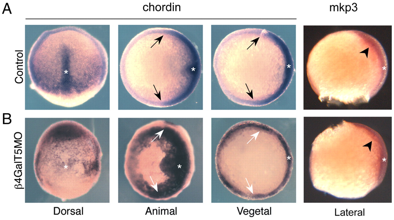 Fig. 4 Misexpression of chordin in ß4GalT5MO embryos. (A) In situ hybridizations of chordin in control-injected embryos show that expression is restricted to the dorsal axis (asterisk in all panels). Arrows indicate the limits of chordin expression and identify the presumptive dorsoventral boundary. (B) Embryos injected with ß4GalT5MO display disorganized chordin expression, including invasion into the presumptive ventral domain. For comparison, the limits of chordin expression in control embryos (A) are indicated by the white arrows. In ß4GalT5 morphants, chordin expression extends beyond the boundaries seen in control embryos and envelope the ventral hemisphere. In contrast to that seen with chordin, the expression of the Fgf target mkp3 (arrowheads) appears unaffected in morpholino-injected embryos.
