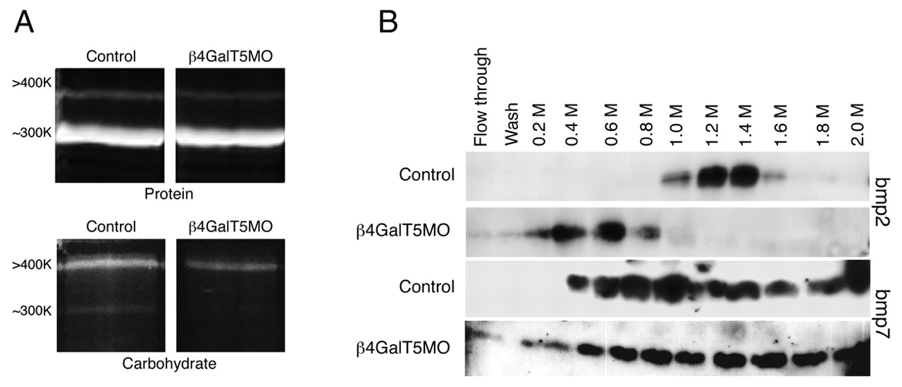 Fig. 6 Decreased binding of BMP2 to ß4GalT5MO proteoglycans. (A) Proteoglycans isolated from control- and ß4GalT5MO-injected embryos were resolved by 6% SDS-PAGE into two high molecular weight bands. Protein and carbohydrate content were revealed by staining with SPYRO and Pro-Q Emerald, respectively. Protein levels in each molecular weight species appear similar between control and ß4GalT5MO samples, whereas the extent of glycosylation is dramatically reduced in ß4GalT5MO embryos. (B) Proteoglycans from control-injected or ß4GalT5MO-injected embryos were bound to an affinity support and assayed for their ability to bind recombinant BMP2 and BMP7. BMP2 showed peak elution from control proteoglycans at 0.8-1.6 M NaCl. BMP2 eluted from ß4GalT5MO proteoglycans at 0.2-0.8 M NaCl. Interestingly, there was no significant difference in the ability of control or ß4GalT5MO proteoglycans to bind recombinant BMP7. Similar results were obtained using proteoglycans isolated from embryos injected with either splice-blocking (MO2) or translation-blocking (MO3) oligonucleotides.