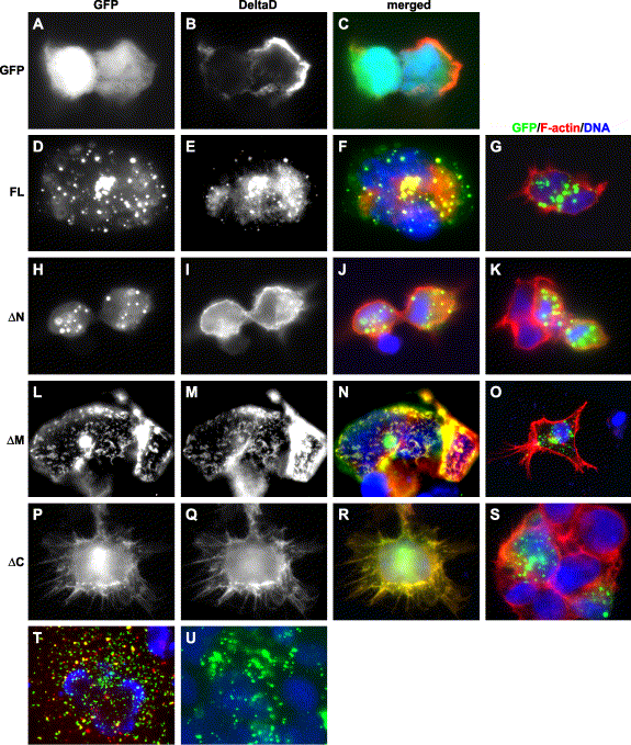 Fig. 6 Mib-Delta interaction alters their subcellular distribution. The immunofluorescent images in each row show the subcellular localization of Mib or its deletion mutants in the presence or absence of DeltaD. The first column from the left shows the subcellular localization of Mib and its deletion mutants. The second column shows the subcellular localization of DeltaD. Third column shows the merged images of the first and second columns plus nuclear stain (blue). The rightmost column shows the merged images of Mib and its deletion mutants (green) in the absence of DeltaD. (A–C) Distribution of DeltaD and EGFP when co-expressed. (D–F) Co-localization of full-length Mib and DeltaD. (H–J) MibΔN and DeltaD do not co-localize. (L–N) MibΔM co-localizes with, but fails to enhance the internalization of DeltaD. (P–R) MibΔC co-localizes with DeltaD, and is distributed on the membrane and in perinuclear regions. (T) Distribution of full-length Mib partially overlaps that of Texas-Red-conjugated Dextran. (U) Full-length Mib, when expressed in zebrafish embryos after synthetic RNA injection, is also distributed in a punctuate manner.