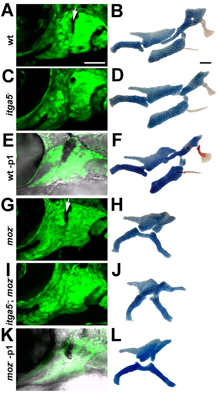 Fig. 7 The development of moz- second-segment cartilage does not depend on p1 endoderm. CNC segments at 36 hpf (A,C,E,G,I,K) and facial skeletons at 4 dpf (B,D,F,H,J,L) from wild-type fli1:GFP (A,B,E,F), itga5b926; fli1:GFP (C,D), moz-; fli1:GFP (G,H,K,L), and moz-; itga5b926; fli1:GFP (I,J) animals. In E and K, inclusion of the Normarski channel shows that p1 endoderm has been selectively ablated by laser irradiation, as evinced by the dark pyknotic nuclei. When p1 is eliminated in either itga5b926; fli1:GFP (C) or p1 ablated (-p1) (E) animals, the anterior portion of the Hm cartilage is lost and Sy cartilage is variably reduced (D,F). However, removal of p1 in moz-; itga5b926; fli1:GFP (I) or p1 ablated moz- (K) animals does not affect the shape of Pq' (J,L). For p1 laser ablations, 13/14 wild-type animals had reduced Hm cartilage and 0/5 moz mutants had reduced Pq'. Arrows denote p1. Scale bars: 50 µm.