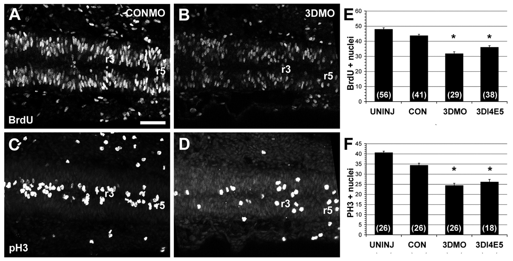 Fig. 3 Sema3d knockdown inhibits cell cycle in the hindbrain. (A-D) Immunodetection in the hindbrain at 17 hpf of BrdU (A,B) and PH3 (C,D) in CONMO (A,C) and 3DMO (B,D) injected embryos. (E,F) Quantification of the number of BrdU (E) and PH3 (F) labeled nuclei in the neuroepithelium of rhombomeres 3-5. Numbers in parentheses indicate n. *P<10-4 compared with CONMO, t-test. (A-D) Dorsal views, anterior is leftwards. Scale bar: 40 μm for A-D.