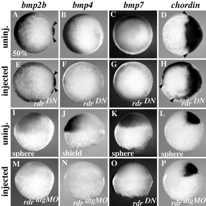 Fig. 2 Loss-of-Mrdr function results in down-regulation of early bmp expression. Expression profiles of bmp2b (Left), bmp4 (Center Left), bmp7 (Center Right), and chordin (Right) in uninjected (A–D) and rdrDN-injected (E–H) early gastrulae (50% epiboly), and in uninjected (I–L) and injected (M–P) embryos at indicated stages of initiation of gene expression. (M, N, and P) rdratgMO-injected and (O) rdrDN-injected are shown. Arrowheads in A and E point to the dorsal (shield) territory of bmp2b expression (24), which, in contrast to the ventrolateral territory, was not affected by rdrDN. Arrowheads in D and H indicate the limits of chordin expression domain. A–H and I–P are animal pole and lateral views, respectively, dorsal to the right.