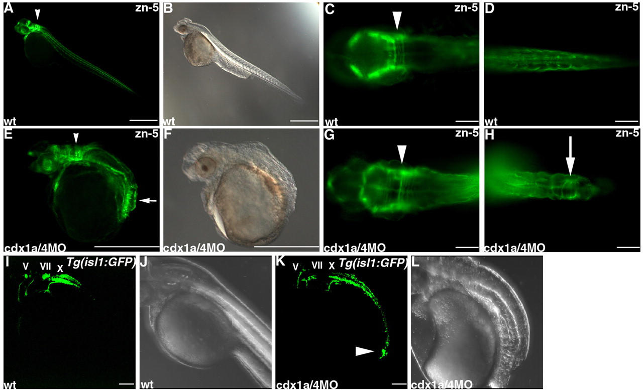 Fig. 3 Ectopic formation of hindbrain neurons in embryos lacking Cdx1a and Cdx4. (A-H) Detection of hindbrain commissure neurons by immunostaining with monoclonal antibody zn-5 of wild-type control (A-D) and cdx1a/4 morphant embryos (E-H) at 3 days post fertilization (dpf). (B,E) Bright field images. Lateral views (A,B,E,F) and high-magnification dorsal views of hindbrain (C,G) and tail regions (D,H) with anterior to the left. zn-5-positive commissure neurons can be recognized by their axonal structures in the hindbrain regions (arrowheads) and ectopically in the posteriormost neural tissue (arrows). (I-L) Detection of cranial motoneurons in control Tg(isl1:GFP) embryos and Tg(isl1:GFP) embryos that received cdx1aMO and cdx4MO at 48 hpf. Bright field images (J,L). The position of trigeminal (V), facial (VII) and vagal (X) motor nuclei was indicated. A cluster of the GFP+ neurons with their axons were detected in the posteriormost region of cdx1a/4 morphant embryos (arrowhead, K). Scale bars: 500 μm in A,B,E,F; 100 μm in C,D,G,H,I,K.