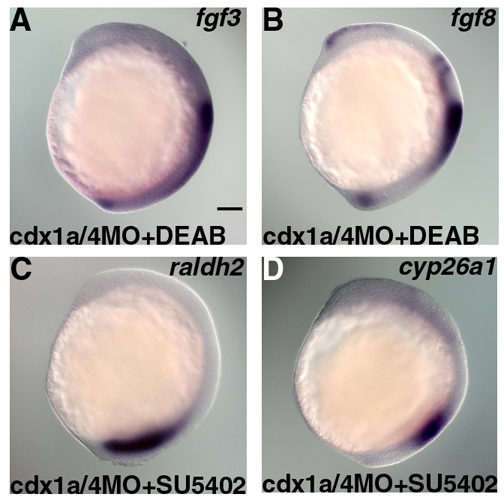 Fig. S3 Inhibition of either the Fgf or RA signal did not perturb the others signaling gradient in cdx1a/4 morphant embryos. Expression of fgf3 (A) and fgf8 (B) in DEAB-treated cdx1a/4 morphants, and expression of raldh2 (C) and cyp26a1 (D) in SU5402-treated cdx1a/4 morphants, at 13 hpf. Scale bar in A: 100 μm for A-D.