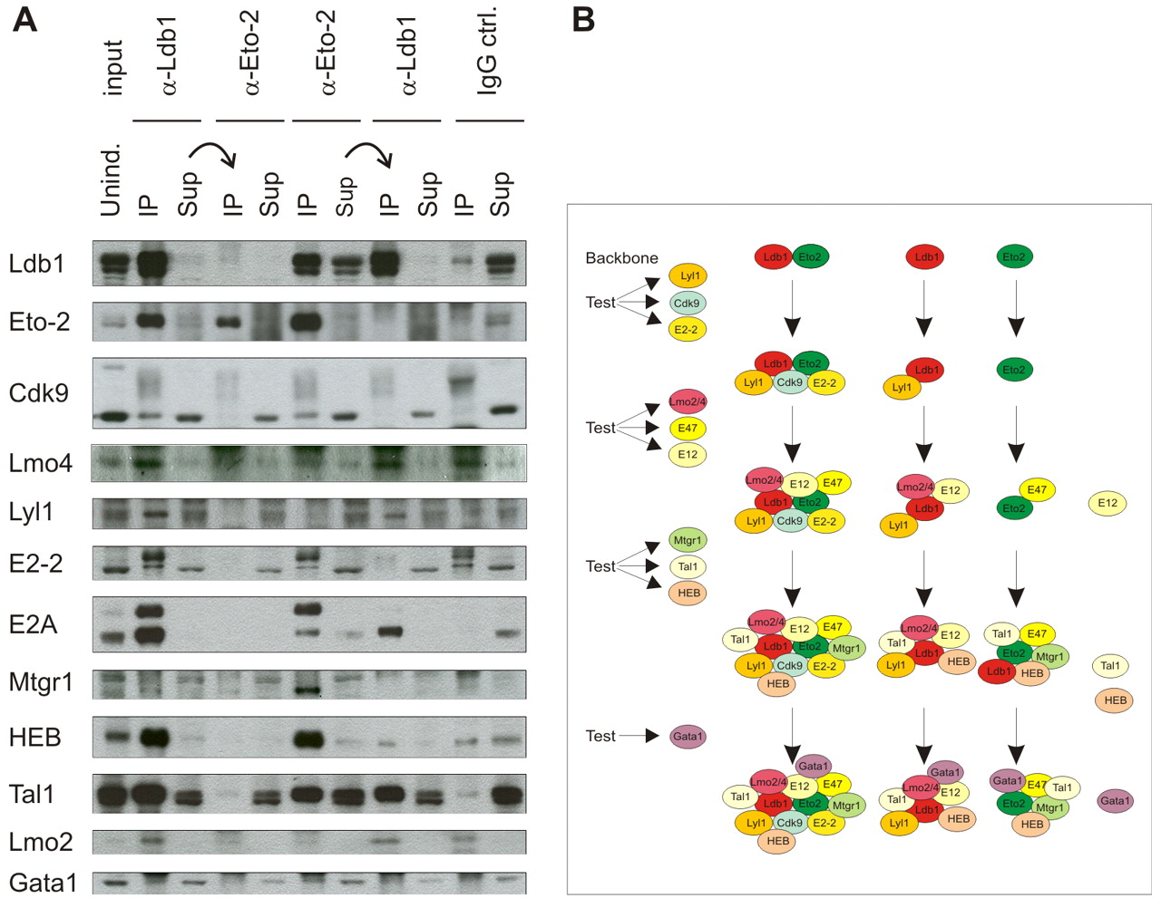 Fig. 3 Sequential immunoprecipitations to investigate Ldb1- and Eto-2-containing complexes. (A) Nuclear extracts of noninduced normal C88 cells were first depleted of either Ldb1 or Eto-2 with their respective antibodies. The supernatants were then incubated with α-Eto-2 or α-Ldb1, respectively. The second supernatant was also loaded to determine which proteins do not interact with either Eto-2 or Ldb1. IgG lanes are control immunoprecipitations carried out with a nonspecific, isotype-matched antibody. (B) Scheme of interacting factors from IP experiments in A (see also Fig. S1A in the supplementary material). Each new line represents the analysis of an additional three transcription factors.