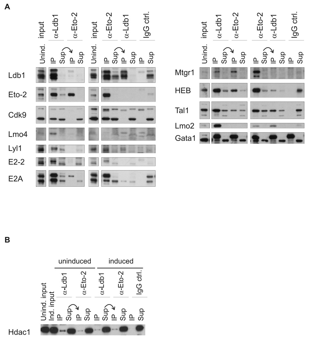 Fig. S1 Sequential immunoprecipitations using nuclear extracts of bio-Ldb1 cells. (A) Sequential immunoprecipitations as shown in Fig. 3 using nuclear extracts from uninduced bio-Ldb1 MEL cells (clone #3F4). (B) Nuclear extracts from uninduced and induced #3F4 cells were subjected to sequential IPs as shown in Fig. 3 and tested for co-immunoprecipitation with α-Hdac1.