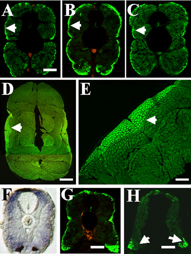 Fig. 5 Different levels of green fluorescent protein (GFP) expression in slow and fast muscles of smyd1-gfp transgenic fish. A-C: GFP expression directly photographed on embryonic sections at 4 days postfertilization (dpf) under a confocal microscope. Slow muscles express higher levels of GFP than fast muscles in three transgenic lines of smyd1-gfp transgenic fish. A, line-27; B, line-32; C, line-51. Arrows indicate slow muscles. D,E: Cross-section showing higher levels of GFP expression in slow muscles of line-32 at 2 months old. Slow muscles are indicated by arrows. F: Cross-section shows smyd1 mRNA expression in both slow and fast muscles at 4 dpf, although the staining appeared slightly stronger in superficial slow muscles. G,H: Cross-sections (dorsal on top) showing GFP expressing slow muscles in wild-type transgenic larvae (G) or yot mutant larvae (H) at 4 dpf. Slow muscles are clearly present at the dorsal and ventral myotome in yot mutant embryos. Scale bars = 150 μm in A-C, 500 μm in D, 200 μm in E, 120 μm in G,H.