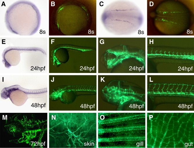 Fig. 1 GFP expression in TG(flk1:GFP)la116 embryos. (A–D) GFP signals driven by the flk(6.4)-GFP transgene can be detected in TG(flk1:GFP)la116 embryos as early as the 8-somite stage. flk1 expression is detected in three patches of cells by in situ hybridization (A). A similar pattern is seen in TG(flk1:GFP)la116 embryos (B). Lateral views are shown in panels A and B and the dorsal views are shown in panels C and D. Anterior to the left. (E–H) GFP expression pattern of TG(flk1:GFP)la116 embryos at 24 hpf (F) resembles the flk1 pattern detected by in situ hybridization (E). Higher magnification images of the head and trunk are shown in panels G and H, respectively. (I–L) GFP expression pattern of TG(flk1:GFP)la116 embryos at 48 hpf (J) resembles the flk1 pattern detected by in situ hybridization (I). Higher magnification images of the head and trunk are shown in panels K and L, respectively. (M) Confocal image of GFP expression in endothelial cells in the brain and brachial arches in 3-day-old TG(flk1:GFP)la116 embryos. (N–P) GFP expression remains active in adult TG(flk1:GFP)la116 fish. Images show GFP signals in endothelial cells in the skin (N), gill (O) and gut (P).
