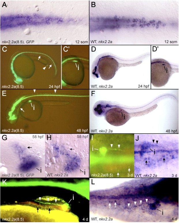 Fig. 1 Stable transgenic expression of GFP compared to nkx2.2a mRNA expression. (A, C, C2, E, G, I, K) GFP fluorescence or GFP mRNA expression in transgenic animals. (B, D, D2, F, H, J, L) nkx2.2a in situ hybridizations in WT zebrafish. (C–F, K) Lateral views. (L) Dorsolateral view. (I, J) Dorsal views. (A, B, G, H) Ventral views. (C2, D2) represent the same embryos shown in panels C and D respectively, focusing on pancreatic expression, dorso-lateral views. (C) Hypochord (arrows), proctodeum (arrowhead). (E) Branchial arches (arrow), dorsal spinal cord cells (arrowheads). (G, H) The arrow indicates GFP and nkx2.2a expression anterior and lateral to the pancreatic islet (i). (I–L) The pancreatic duct is indicated by arrowheads and enteroendocrine cells by arrows. i = pancreatic islet.