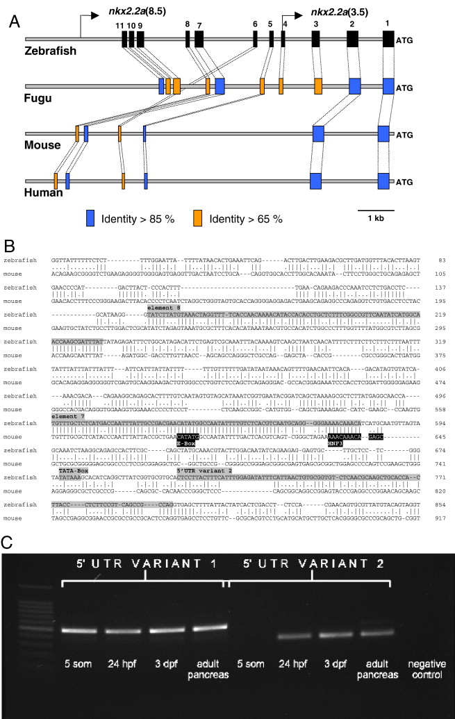 Fig. 2 Sequence homology between the regulatory regions of zebrafish nkx2.2a and other vertebrate Nkx2.2 genes. (A) Schematic alignment of four vertebrate Nkx2.2 promoter regions (10 kb). Conserved sequence blocks in the zebrafish sequence are shown as black squares. The degree of identity between a given zebrafish element and the corresponding region in one of the other sequences is indicated by different colours, orange for > 65% identity and blue for > 85% identity. The promoter fragments used for the two transgenic lines are depicted in the zebrafish sequence. (B) Sequence alignment of the zebrafish genomic region containing elements 7 and 8 as well as a sequence identical to 52-region of the identified nkx2.2a EST harbouring an alternative 52UTR (‘variant2’) and the corresponding genomic sequence in mouse. Elements 7 and 8, the region corresponding to the alternative 52UTR and a putative TATA-box are shaded in grey. The conserved E-Box motif and the HNF3 binding motif in the mouse sequence are marked in black. (C) RT-PCR to identify the two variant nkx2.2a transcripts at various developmental stages. Note that mRNA variant 2 is not detectable before the onset of pancreatic hormone gene expression.