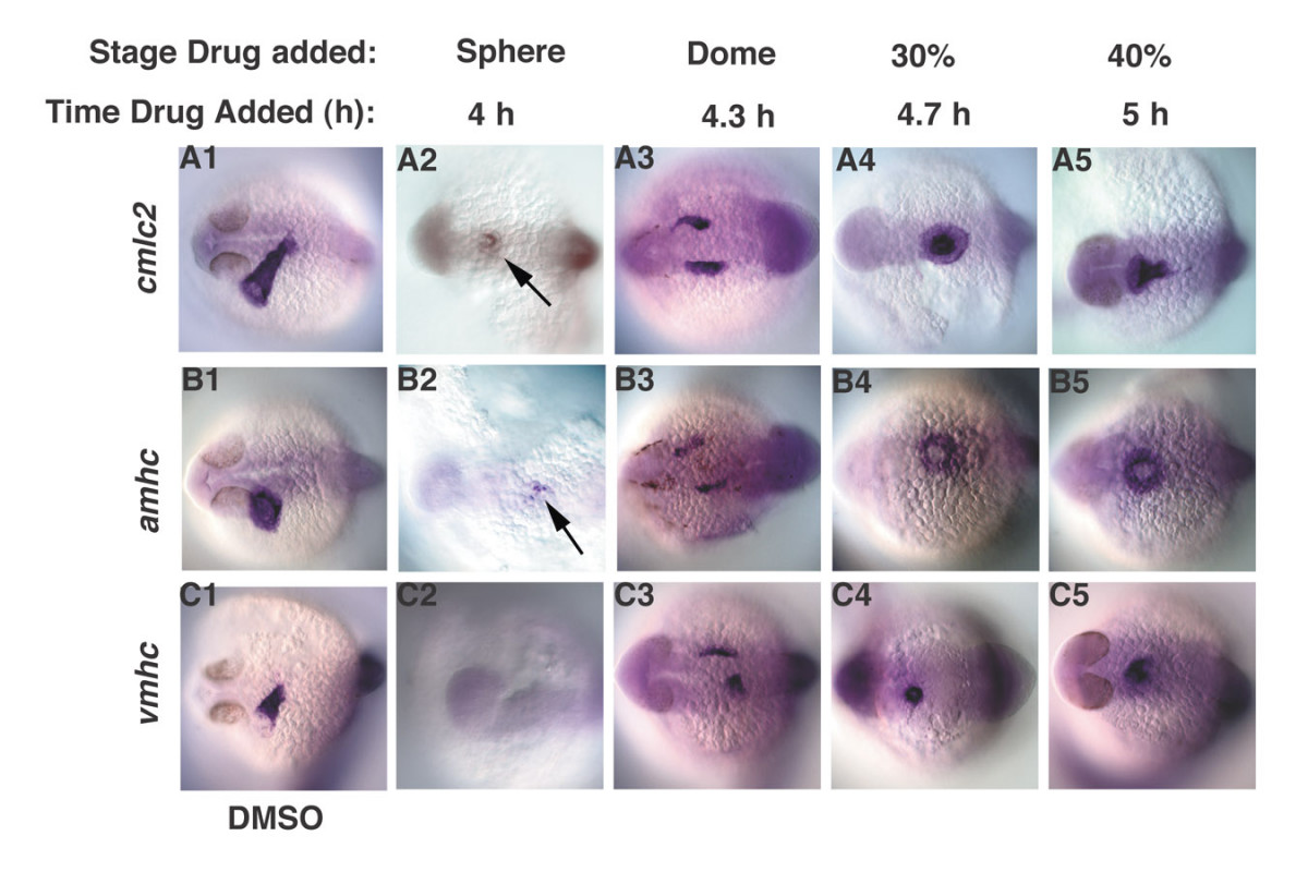 Fig. 7 Nodal signals pattern the ventrolateral mesoderm along the animal-vegetal axis in a time-dependent manner. Heart myocardial cell fates were examined in embryos treated with DMSO (A1-C1), or with SB-431542 at various time points (A2-C5). (A2-C2) Embryos treated at 4 h, express small amounts of amhc and cmlc2, but not vmhc (arrows). (A3-3) cmlc2, amhc and vmhc are bilaterally expressed in embryos treated at 4.3 h. (A4-C5) All heart markers are expressed at the midline in embryos treated at 4.7 h. Images are dorsal views at 24 h, anterior to the left.
