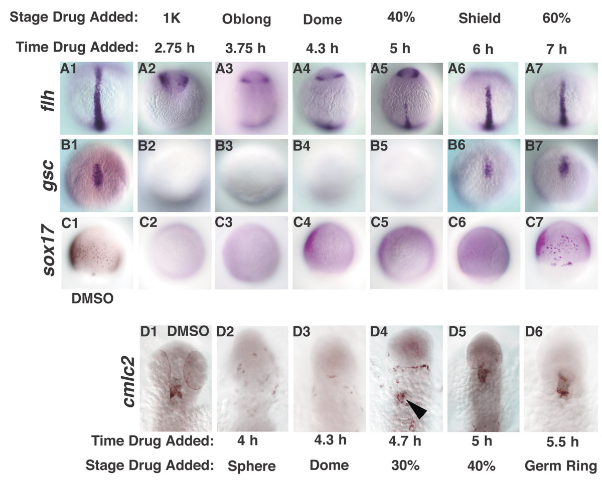 Fig. 8 Cell fate specification is delayed squint mutants. Cell fates were examined in sqt mutant embryos treated with DMSO (A1-D1), or with SB-431542 at various time points. (A1-7) flh was first expressed at the midline in embryos treated at 5 h (A5). (B2-7) gsc expression is first detected in embryos treated at 6 h (B6). (C2-7) sox17 expression is first detected when embryos are treated at 7 h (C7). (D1-7) cmlc2 expression was first detected in embryos treated 4.7 h (D4, arrowhead). Dorsal views of 10 h (A1-B7), 8 h (C1-C7) or 24 h (D1-D6). In D1-D6, anterior is up. The embryos in Figs. 8 and 9 are from the same clutch and weretreated in parallel, along with wild type controls (not shown).