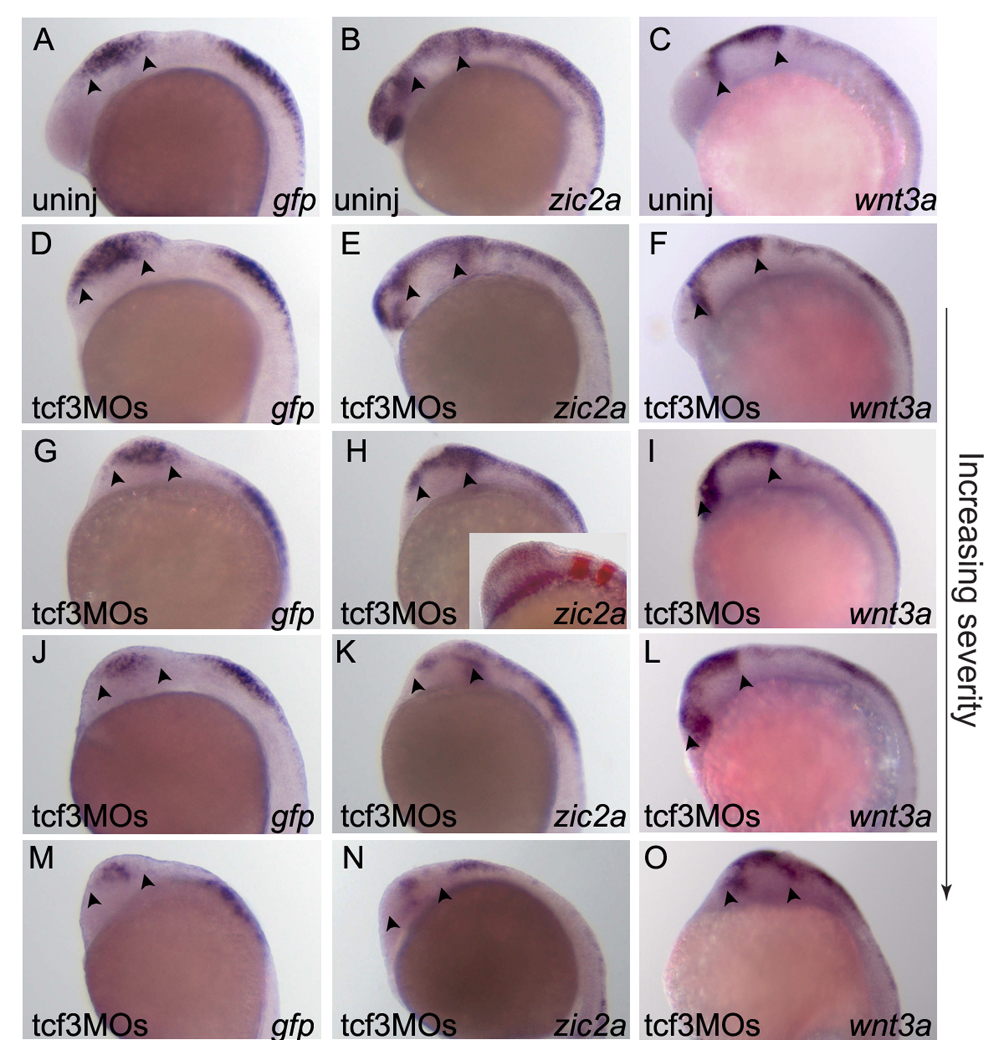 Fig. S4 Tcf3 reduction affects midbrain size. (A-C) Uninjected control embryos showing normal zic2aD5:gfp (A), zic2a (B) and wnt3a (C) expression at 18-somites. (D-O) Embryos injected with tcf3 MOs and assayed for zic2aD5:gfp (G,J,M), zic2a (H,K,N), or wnt3a (I,L,O) expression at 18-somites. Knockdown of Tcf3 resulted in expanded expression of all markers in the midbrain at low MO concentrations. This is most likely due to the previously documented overall midbrain expansion (D-I). At higher MO concentrations, zic2aD5:gfp and zic2a were reduced in midbrain (J,M,K,N), whereas wnt3a expression remained strong (L,O). Embryos are shown in lateral view, anterior to the left. Arrowheads mark anterior and posterior limits of the midbrain.