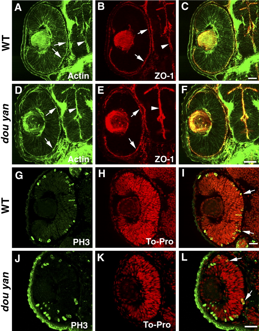 Fig. 9 The dou yanmi234 mutation does not affect apical epithelial polarity. A-C: Apical localization of adherens junctions in the retina (arrows) and brain (arrowheads) of the 48 hours postfertilization (hpf) wild-type embryos is visualized by the staining patterns of ZO-1 (red) and adherens junction-associated actin bundles (A, green, arrows). D-F: ZO-1 (red) and adherens junction-associated actin bundles (green) localize properly to the apical surface of the retina (arrows) and brain (arrowheads) in dou yanmi234 embryos at 48 hpf. G-L: In 48 hpf retinas, the M-phase nuclei as visualized with anti-phosphorylated-Histone H3 antibody (PH3, green) localize to the apical regions of the retinas of mutant (J-L) and wild-type (G-I) embryos. Cell nuclei were labeled with TO-PRO (red). Scale bars = 20 μm.