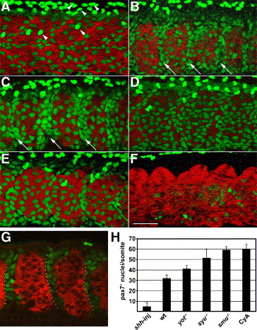 Fig. 2 Hedgehog signaling negatively regulates the number of Pax7+ myogenic precursors. Embryos were labeled at the prim5 (24 h) stage for Pax7 (green) and myosin (MF20, red). (A) In wild-type embryos, the surface of each somite has two types of Pax7+ myogenic precursors, moderately labeled cells that are part of the somite, and more brightly labeled, dorso-ventrally elongated neural crest cell nuclei. (B, C) smu(smo)-/- and CyA-treated wild-type embryos have more Pax7+ myogenic precursors than wild-type control embryos, particularly in the anterior part of each somite (arrows). (D, E) In syu(shh)-/- and yot(gli2)-/- embryos, the number of Pax7+ nuclei is intermediate between untreated wild-type and smu(smo)-/- or CyA-treated wild-type embryos. (F) shh mRNA-injected wild-type embryos have virtually no Pax7+ nuclei. (G) A single optical slice of a CyA-treated wild-type embryo through the middle part of somites, demonstrating the gaps between myotomes that are filled with Pax7+ cells. Many of the Pax7+ cells are within the anterior of each somite (dotted outline). (H) Quantitation of the number of Pax7+ myogenic precursors per somite in each genotype or treatment (mean of 5 embryos per genotype or treatment, somites 16–18 were counted; error bar = standard deviation). Panels A–F are projections of Z-stack confocal sections (see Materials and methods), panel G is a thin optical slice, all panels are anterior to the left, dorsal up; somite 17 is shown in each panel. Scale bar = 50 μm.