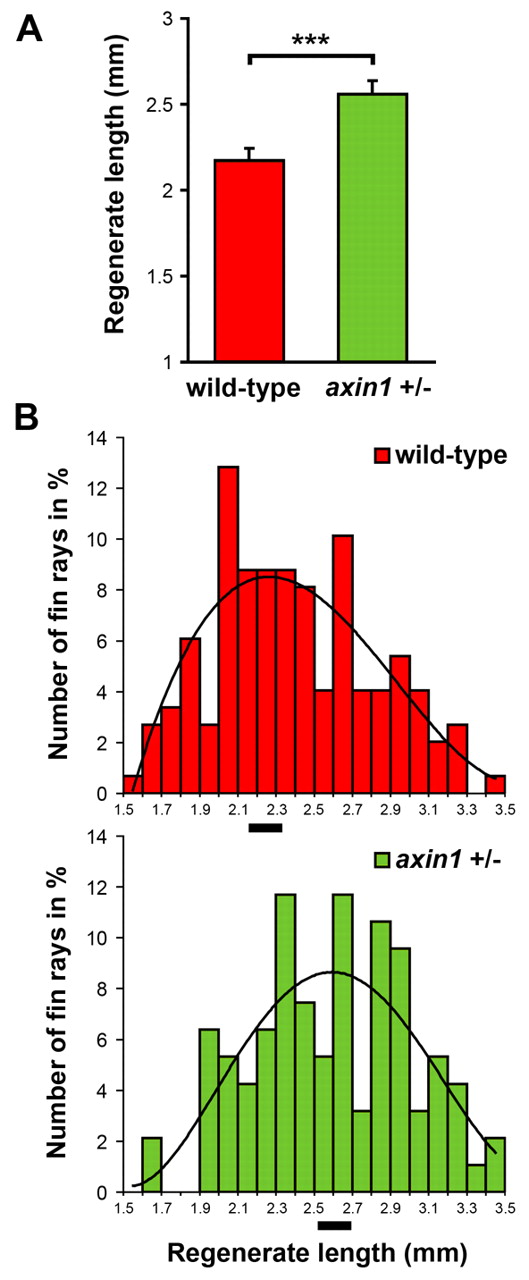 Fig. 5 Fins regenerate faster in fish heterozygous for a loss-of-function mutation in axin1. (A) Average length of regenerating tail fins at 7 dpa is increased in fish heterozygous for an axin1 loss-of-function mutation (mbltm013) compared with wild-type siblings. Results of one representative experiment of three are shown. To determine the length of the regenerate for individual fish, the average length of the third, fourth and fifth dorsal regenerating fin ray was calculated. n=12 wild-type fish and 9 mbl heterozygous fish; error bars represent the s.e.m. of the average regenerate lengths; ***, P=0.0009 (one-tailed). (B) The number of fin rays (in percent of the total number counted) is plotted against the length of the regenerate (in 0.1 mm intervals) for wild-type (upper bar graph) and axin1 heterozygous fish (lower bar graph). The curves represent a fifth-order polynomial trendline. The average regenerate length is marked by black bars at the x-axis. 148 fin rays were counted (combined results from three experiments) in 19 wild-type fish and 94 rays were counted in 10 axin1+/- fish.