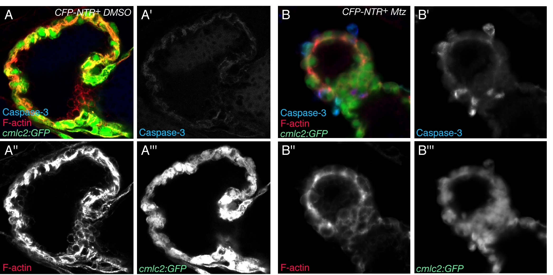 Fig. S1 Tissue-specific damage to the heart upon exposure of Tg(cmlc2:CFP-NTR)s890 larvae to Mtz. Merged images and single channels of heart sections of Tg(cmlc2:CFP-NTR)s890; Tg(cmlc2:GFP) larvae treated with DMSO- (A-A’’’- magnification of Fig. 2E) and Mtz- (B-B’’’ - same as Fig. 2G) immunostained for activated Caspase-3 in blue (A’, B’) and stained with rhodamine phalloidin in red (A’’, B’’), Tg(cmlc2:GFP) in green (A’’’, B’’’). Activated Caspase-3 expression (B’) was detected exclusively in Tg(cmlc2:GFP) expressing cells (B’’’) indicating that cell death occured specifically in cardiomyocytes and without affecting the neighboring CFP-NTR- cells.