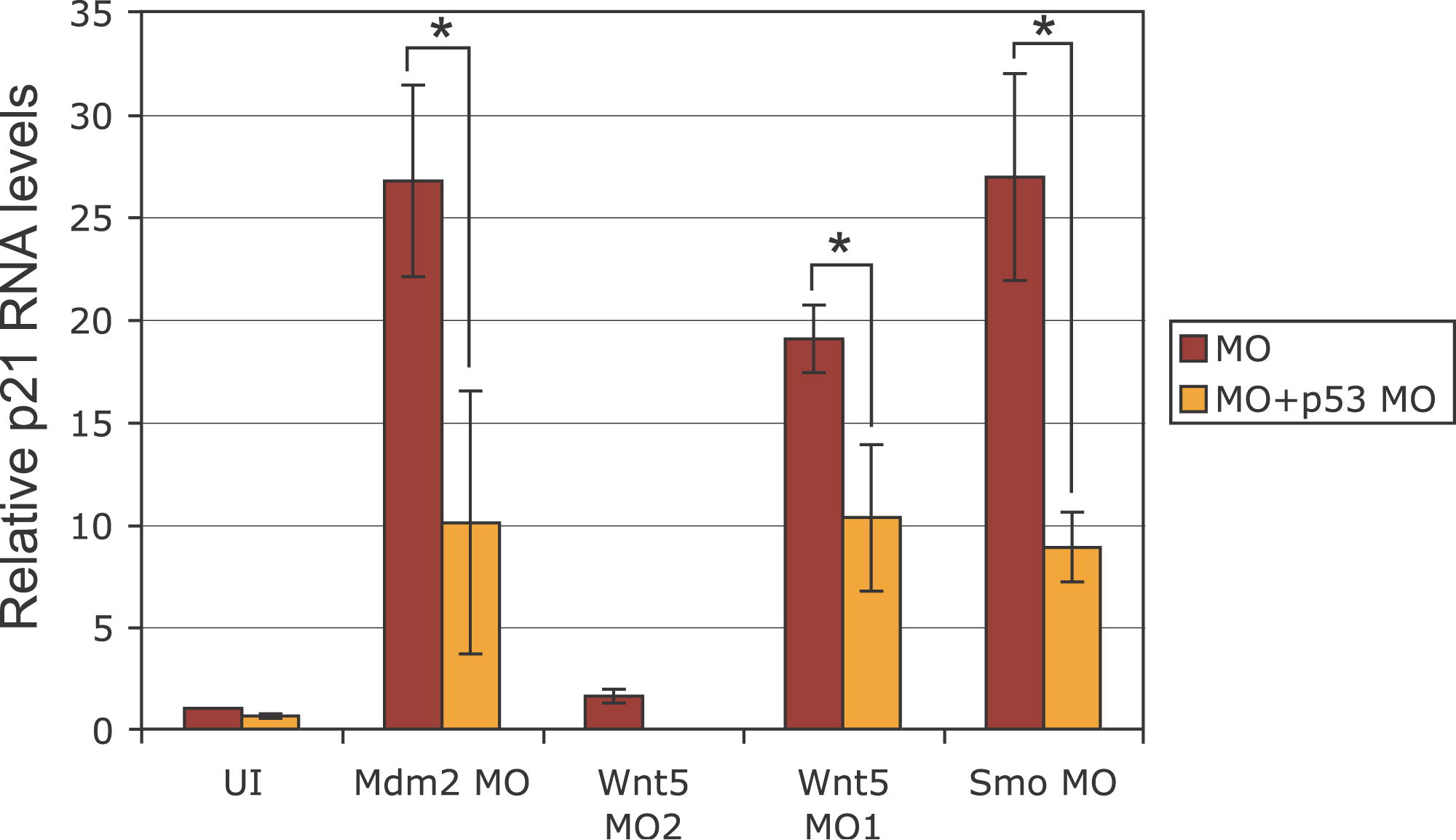 Fig. 8 Quantitative RT-PCR of p21/WAF/CIP in Various Morphants. p21 RNA levels were significantly increased in MO-injected embryos that showed neural death (Smo MO, Wnt5 MO1, and Mdm2 MO) as compared to the uninjected control (UI). Interestingly, p21 levels were not significantly altered by Wnt5 MO2 (which does not induce neural death). Very importantly, p21 levels were significantly reduced in the respective MO-injected embryos upon p53 co-knockdown (Mdm2 MO p < 0.01, Wnt5 MO2 p < 0.01, Smo MO p < 0.002; t-test p values for unpaired sets), strongly suggesting that p21 is transcriptionally upregulated by p53 in the morphants with neural death. Error bars indicate standard deviation.