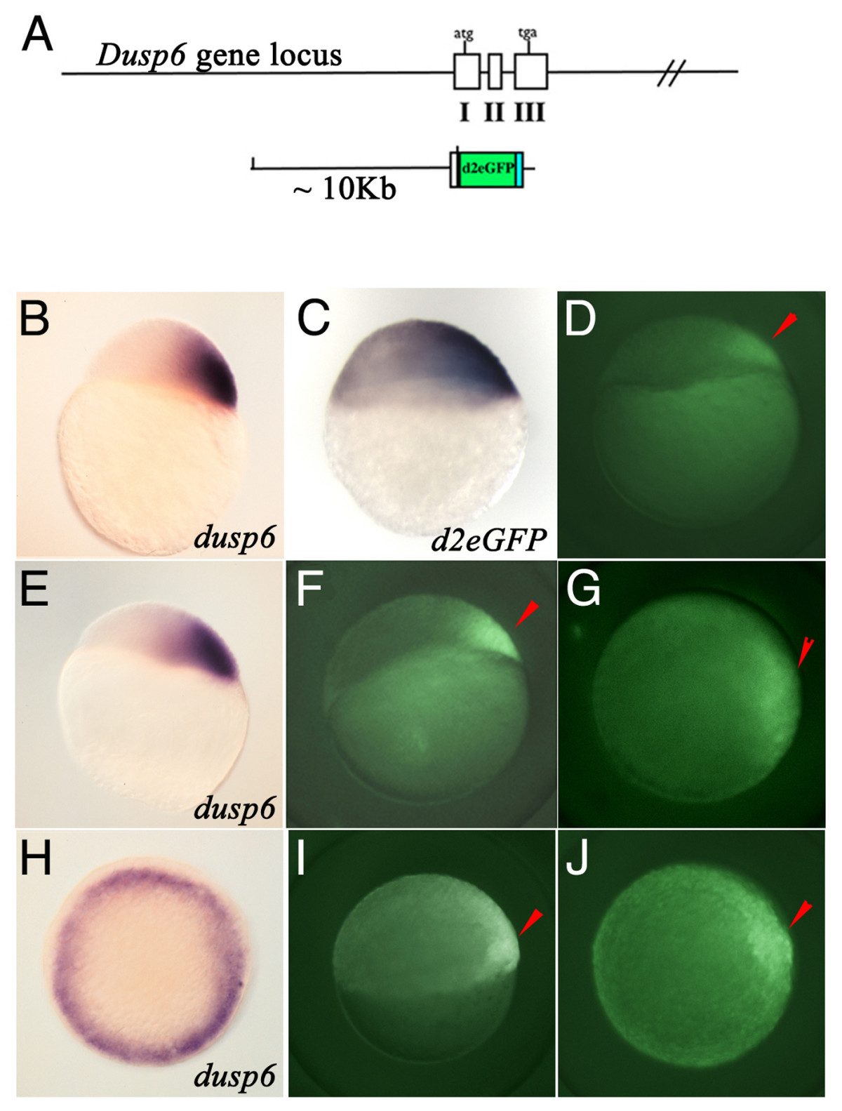 Fig. 1 Generation of Dusp6 DNA construct and expression of d2EGFP in transgenic embryos. (A) Diagram showing the Dusp6 gene locus and the DNA construct used in generating transgenic zebrafish. (B, E, & H) dusp6 expression at oblong (B), dome (E), and shield stage. (C) d2EGFP mRNA expression at sphere stage. (D, F, G, I, & J) Tg(Dusp6:d2EGFP)pt6 embryos at dome (D), 30% epiboly (F & G), and shield (I & J) stage. (B-F & I) are lateral views and (H & J) are animal views. Red arrowheads mark dorsal region of the embryo.