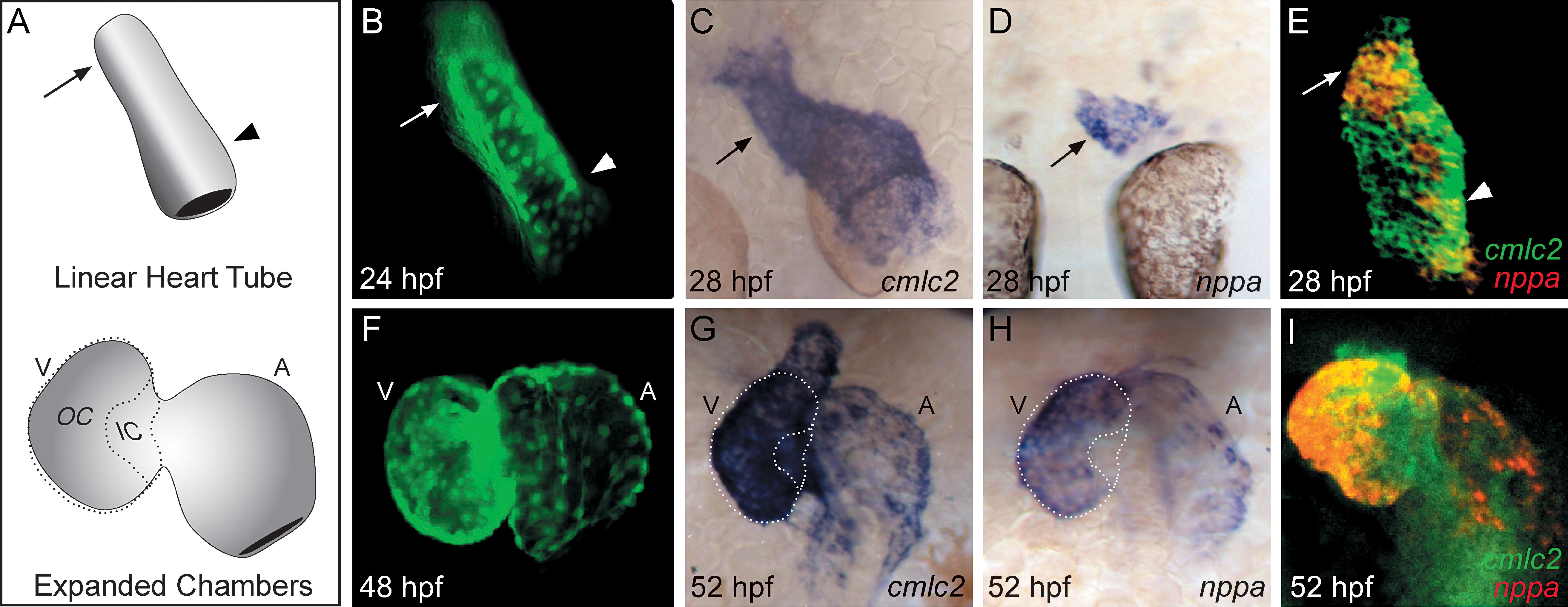 Fig. 1 nppa Expression Distinguishes the OC and IC of the Zebrafish Ventricle. (A) Cartoon of the zebrafish LHT (24–28 hpf) and expanded chamber (48–58 hpf) stages. The expanded ventricle (V) and atrium (A) each exhibit an OC and IC, as outlined on the ventricle. (B and F) Live images of embryos expressing Tg(cmlc2:egfp) in the LHT (dorsal view) and in the expanded chambers (frontal view). The arterial and venous halves of the LHT will form the ventricle and atrium, respectively [51]. Specific regions of the LHT will expand to create the OC of the ventricle ([B] arrow) and the OC of the atrium ([B] arrowhead). (C–E and G–I) Whole-mount in situ hybridization comparing expression of the myocardial gene cardiac myosin light chain 2 (cmlc2) with expression of nppa at LHT ([C–E] dorsal view) and expanded chamber ([G–I] frontal view) stages. (E and I) Fluorescent in situ hybridization depicts cmlc2 expression in green and nppa expression in red. In the LHT, nppa expression is regionally restricted to the future OC of the ventricle ([C–E] arrow); at this stage, faint expression is also detectable in the future OC of the atrium ([E] arrowhead). In the expanded chambers, nppa is expressed in the OC, but absent from the IC and atrioventricular canal (G–I).