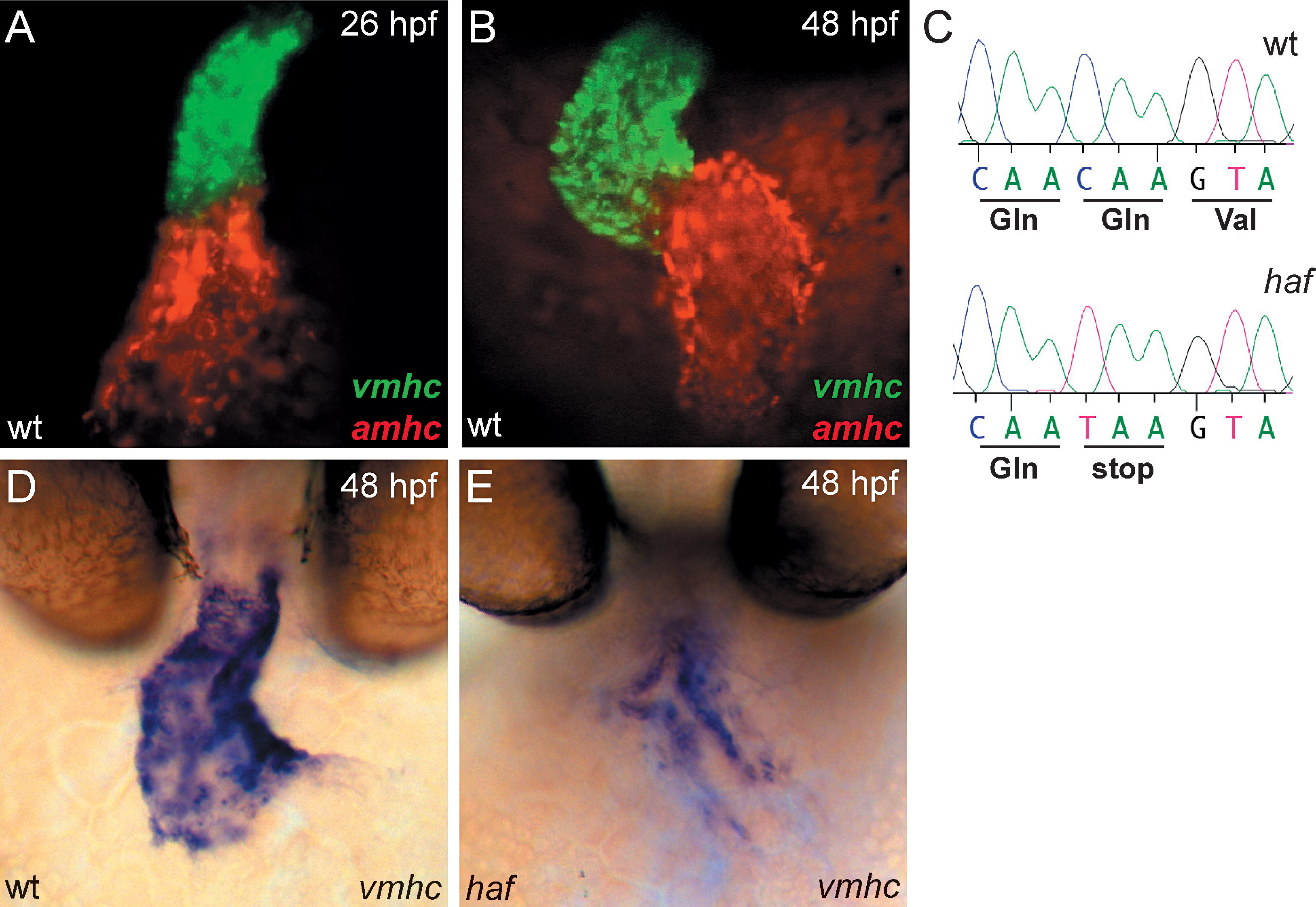 Fig. 6 hafsk24 Is a Strong Loss of Function Allele of vmhc, a Ventricle-Specific Myosin Heavy Chain Gene with Expression Complementary to amhc. (A and B) Fluorescent in situ hybridization for vmhc (green) and amhc (red) in wild-type (wt) embryos at LHT ([A] 26 hpf, dorsal view) and expanded chamber ([B] 48 hpf, frontal view) stages. At all stages examined, vmhc is expressed in the ventricular myocardium [51]. In contrast, amhc expression is restricted to the atrial myocardium [28]. (C) Comparison of vmhc coding sequence in wt and hafsk24 embryos reveals a C to T transition at position 3,094 that results in a premature stop codon in hafsk24. (D and E) Whole-mount in situ hybridization depicts frontal view of vmhc expression in wt and haf at 48 hpf. vmhc expression is dramatically reduced in the haf mutant ventricle.