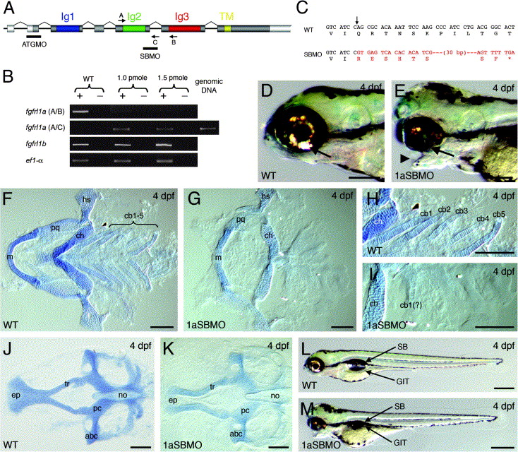 Fig. 4 Targeted depletion of Fgfrl1a results in specific defects within the pharyngeal cartilage. (A) Genomic organization of fgfrl1a illustrating the Ig-like (Ig1, 2 and 3) and transmembrane (TM) domains, and the target site for the splice-blocking (SBMO) and ATG (ATGMO) morpholinos. ORF and untranslated regions highlighted by dark and light shading, respectively. The location and orientation of primers used for RT-PCR detection of altered splicing are indicated by arrows. (B) Semi-quantitative RT-PCR illustrating specific depletion of normal fgfrl1a splicing following early delivery of 1.0 and 1.5 pmol doses of SBMO (+, reverse transcriptase present; -, reverse transcriptase absent). Primer combinations are bracketed. (C) Predicted translation of fgfrl1a following SBMO-mediated defective splicing. Arrow denotes splice site between Ig2- and Ig3-encoding exons. Black and red text corresponds to coding and intronic sequence, respectively. (D, F, H, J and L) 4 dpf wildtype embryos. (E, G, I, K and M) 4 dpf Fgfrl1a morphant embryos. (D/E) lateral views. (F–K) Dissected and flat-mounted cartilaginous elements stained with alcian blue. (F/H and G/I) Ventral cartilage elements from wildtype and Fgfrl1a morphant larvae, respectively. (J and K) Neurocranium from wildtype and Fgfrl1a morphant larvae, respectively. Arrowhead marks dysmorphic jaw. Abbreviations: abc, anterior basicranial commissure; cb1–5, ceratobranchial arch 1–5; cb1(?), presumptive remnants of ceratobranchial element 1; ch, ceratohyal; ep, ethmoid plate; GIT, gastrointestinal tract; hs, hyosymplectic; m, Meckel’s cartilage; no, notochord; pc, parachordal; pq, palatoquadrate; SB, swim bladder; tr, trabecula. Scale bars: 250 μm in D and E; 100 μm in F–K; 500 μm in L and M.