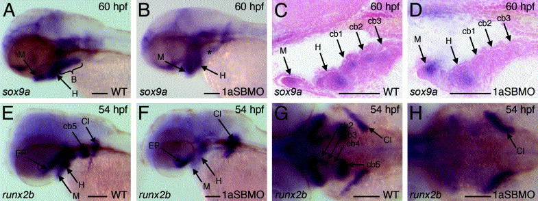 Fig. 6 Fgfrl1a is essential for chondrogenesis within the ceratobranchial arches. (A/C and B/D) sox9a expression within pharyngeal domain of 60 hpf wildtype and Fgfrl1a morphant larvae, respectively. (A/B and C/D) Lateral views and equivalent sagittal sections, respectively. Asterisk in B marks absence of expression within branchial arches. (E/G and F/H) runx2b expression within pharyngeal region of 54 hpf wildtype and Fgfrl1a morphant larvae, respectively. (E/F and G/H) Lateral and dorsal views, respectively. Abbreviations: B, branchial arches; cb1–5, ceratobranchial arches 1–5; Cl, cleithrum; EP, ethmoid plate; H, hyoid arch; M, mandibular arch. Scale bars: 100 μm in A–H.