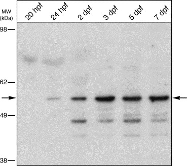 Fig. 3 Temporal expression of Foxe3 protein. Immunoblot detection of Foxe3 in extracts from 20 and 24 hpf whole embryos and heads at 2, 3, 5 and 7 dpf. The Foxe3 protein is barely detected at 20 and 24 hpf (arrow). The expression level increases through 7 dpf compared to the earlier time points. Relative location of molecular weight markers are shown to the left (in kDa).
