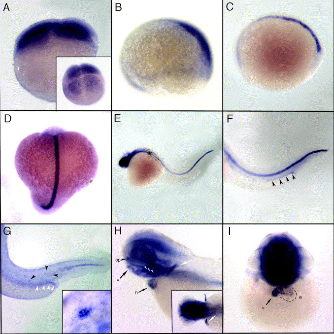Fig. 2 Expression of zebrafish trpV4 by whole mount in situ hybridization. trpv4 mRNA expression is ubiquitous in blastomeres beginning at the 4-cell stage (A, inset-dorsal view) through to late epiboly. (B) At 75% epiboly, trpv4 shows enhanced expression on the posterior dorsal side of the embryo. At the one somite stage (C) and continuing on until 18 hpf (D), expression is predominately in the notochord with low level expression in the anterior presumptive head region. (E) Head expression becomes enhanced by 24 hpf. (F) At 32 hpf, notochord expression remains strong and trpv4 signal can be detected in the pronephric ducts (black arrow heads). (G) Expression in the notochord is reduced by 40 hpf, decreasing in an anterior to posterior direction. Pronephric duct expression (white arrow heads) persists and staining can be detected in the lateral line organs (black arrow heads, and inset). (H and I) At 3 dpf trpv4 mRNA is highly expressed in brain and head structures. Expression can be seen in the olfactory placodes (op), in chondrogenic tissues including the forming jaw bones (asterisk), pharyngeal arches (white arrow heads), and pectoral fin buds (white arrows, and inset). Expression in the heart (h) is easily detected at this stage, primarily in the ventricle (v) and upper atrium (a).