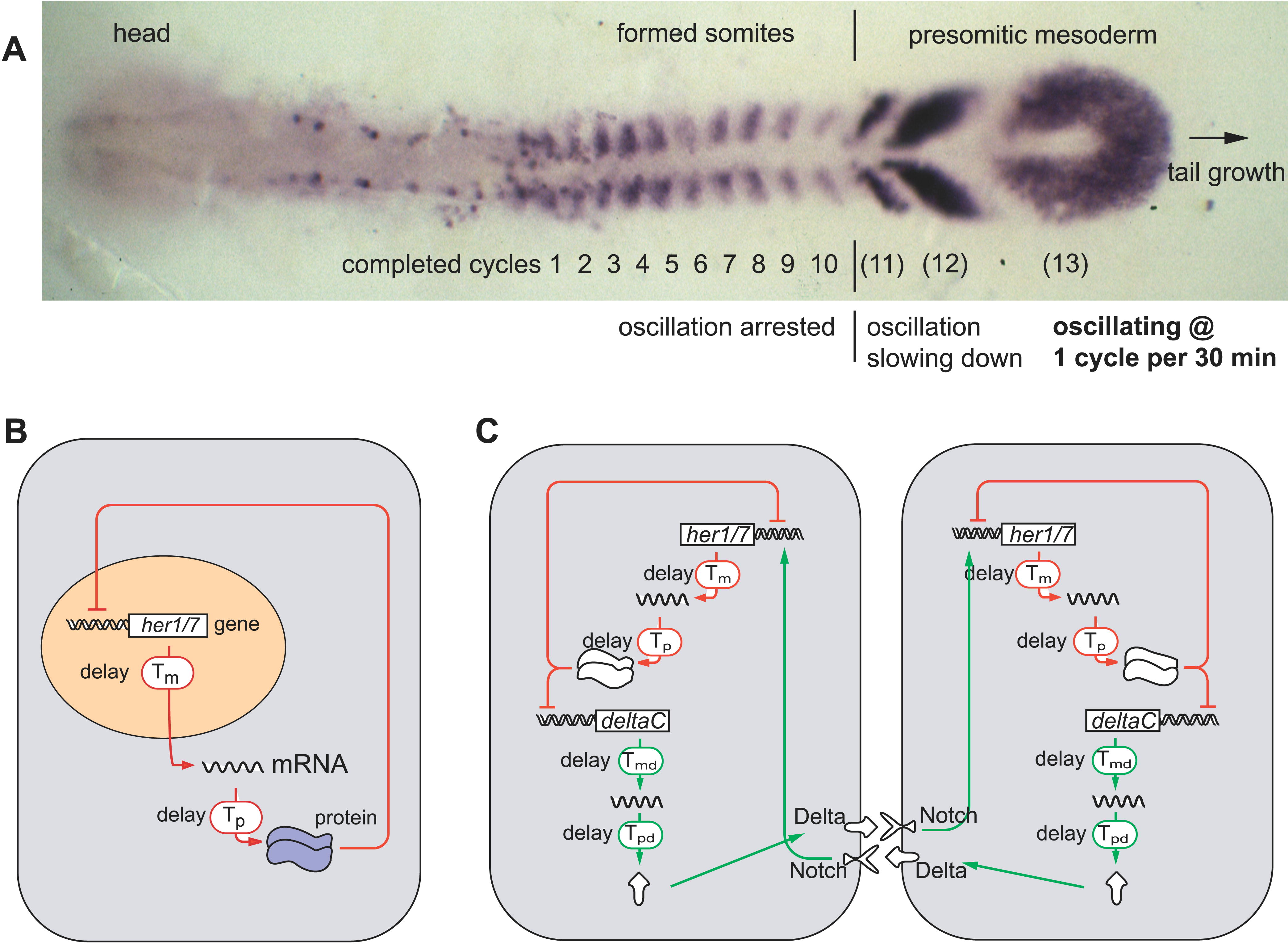 Fig. 1 Mapping of Temporal Oscillations into a Spatial Wave Pattern during Somite Segmentation, and a Model of the Oscillator Mechanism (A) The expression pattern of the oscillating gene deltaC in a zebrafish embryo at the ten-somite stage. (B) In each cell of the presomitic mesoderm, it is proposed that a her1 or her7 autoinhibition negative feedback loop generates oscillations. (C) Communication via the Delta-Notch pathway is proposed to keep oscillations in adjacent cells synchronized. The oscillations depend critically on the delays (Tm, Tp, Tmd, and Tpd) in the feedback loops. (A–C) are slightly modified from [25].