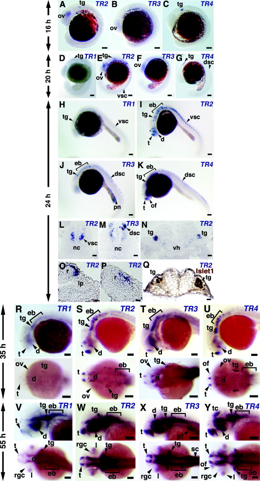 Fig. 3 Expression patterns of TR1-4 in developing zebrafish embryos. Antisense RNA probes for whole-mount in situ hybridization were specific for each group and prepared as described in Section 2. (A–C) 16 hpf embryos. (D–G) 20 hpf embryos. (H–P) 24 hpf embryos. L, M, and N show 10 µm frozen sections at the trunk level (L and M) and at the level of hindbrain (N). TR2 and TR3 mRNAs are expressed in the different part of neural tube (L and M). TR2 expression was also observed in trigeminal ganglia (N). O and P show 10 µm frozen sections at the eye level. The strong TR2 signal was detected in dorsal (O) and posterior (P) retina. (Q) 24 hpf embryos first hybridized to TR2 probe and then stained with Islet1 antibodies. Frozen section at the hindbrain level is shown. Trigeminal ganglia (tg) express both TR2 (N) and islet1 (Q). (R–U) 35 hpf embryos. TR1 showed weak signal while all other transcripts are strongly expressed in telencephalon, ventral diencephalons and dorsolateral and epibranchial placodes/ganglia. TR3 has a stronger expression at the preoptic commissure than other transcripts and TR4 is expressed in the olfactory placode. (V–Y) 55 hpf embryos. All transcripts strongly expressed in telencephalon, diencephalons and dorsolateral and epibranchial placodes/ganglia. TR4 has specific expressions in the optic tectum (arrowhead). Abbreviations: d, diencephalon; dsc, dorsal spinal cord; eb, epibranchial placode/ganglia; l, lens; lp, lens placode; nc, notochord; of, olfactory placode; ov, optic vesicle; pn, pronephros; r, retina; rgc, retinal ganglion cells; sc, spinal cord; t, telencephalon; tc, tectum; tg, trigeminal placode/ganglia; vh, ventral hypothalamus; vsc, ventral spinal cord. (A–C) Scale bar, 0.1 mm. (D and E) Scale bar, 0.01 mm. (F and G) Scale bar, 0.1 mm.