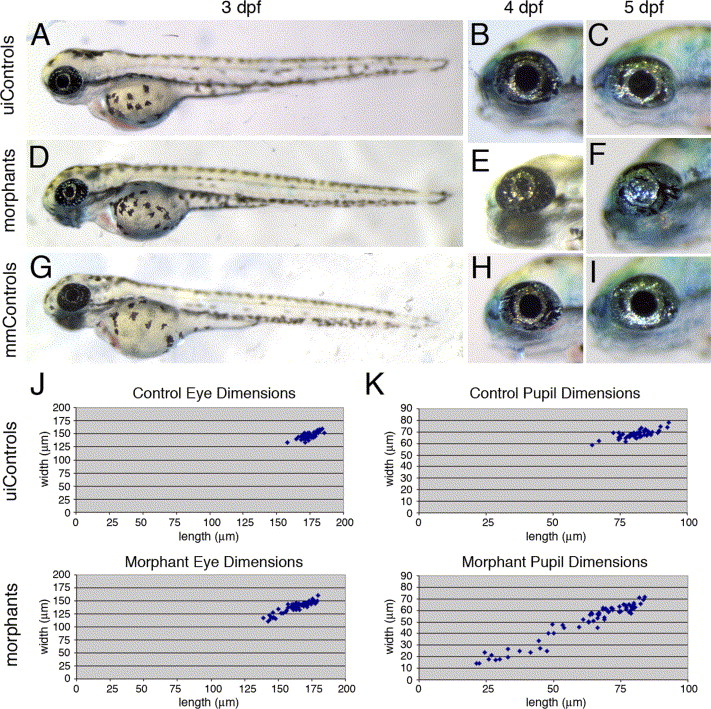 Fig. 6 The foxe3 morphants display reduced eye and pupil size. The foxe3 morphants (panels D-F) are compared to uninjected (panels A–C) and mismatch control morpholino-injected embryos (panels G–I) at 3, 4 and 5 dpf. At 3 dpf, the eyes of the foxe3 morphants (panel D) are slightly reduced in size compared to the controls (panels A and G). At 4 dpf, small pupils also characterize the morphants (compare panel E to panels B and H). The eyes of some morphants lacked a pupillary opening at 5 dpf (compare panel F to panels C and I). The distribution of eye dimensions that were measured along the anterior-posterior axis (length) and dorsal–ventral axis (width) of uninjected control and foxe3 morphants (5 dpf) are shown in panel J. The distributions of control and foxe3 morphant pupil dimensions are also shown (panel K).