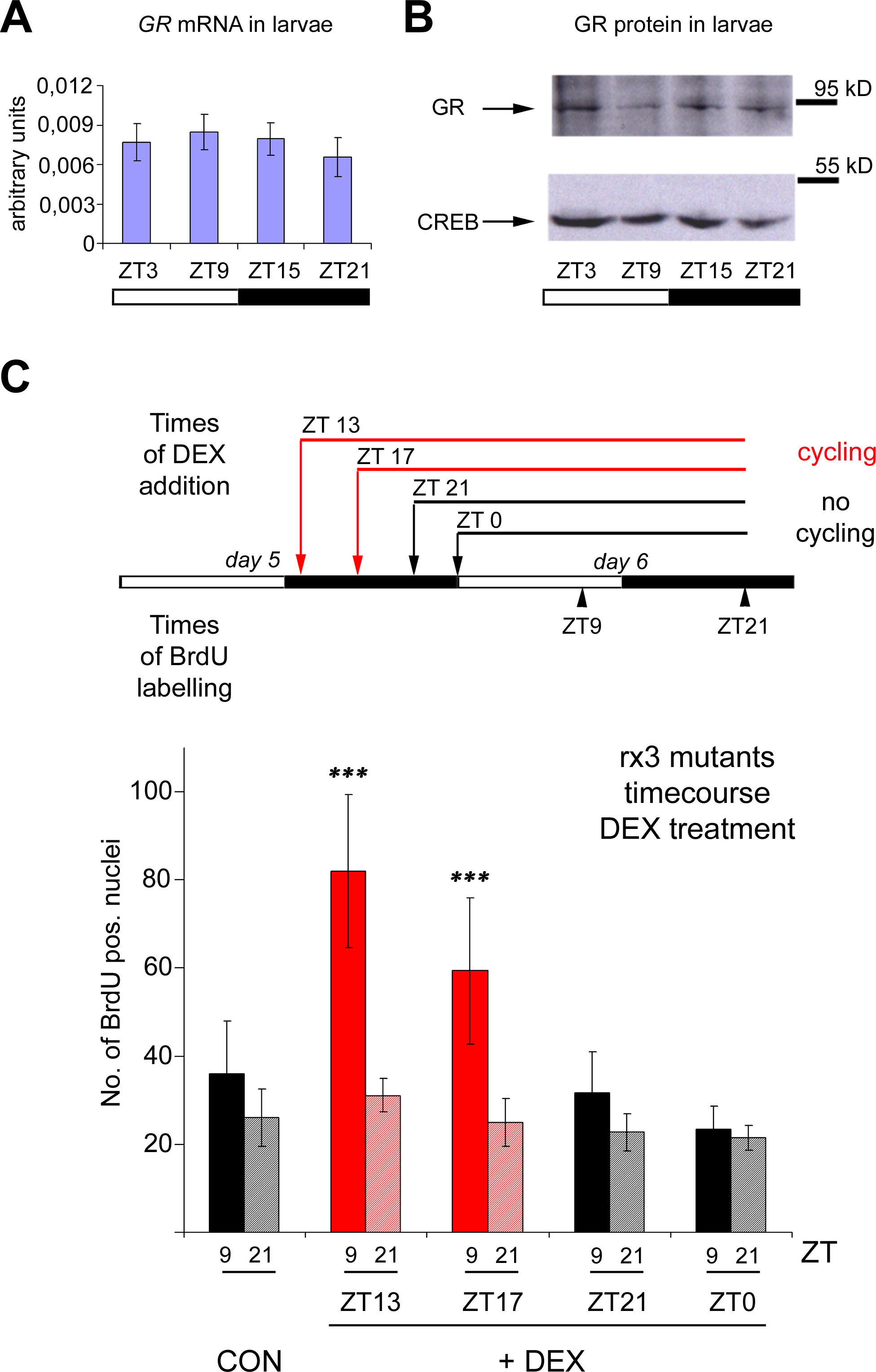 Fig. 5 Shorter-Term Treatment with Dexamethasone Also Rescues Cell Cycle Rhythms in Strong rx3 Mutants (A and B) Expression analysis of the zebrafish GR. (A) GR mRNA expression as determined by quantitative RT-PCR in wild-type larvae at four circadian time points. No significant oscillation is apparent (one-way ANOVA [analysis of variance], p = 0.4231). Error bars show the 95% confidence interval of the mean from three independent experiments. As a control, per4 mRNA levels were assayed in the same samples and shown to exhibit a high-amplitude rhythm (unpublished data; see also Figure2A). (B) Representative Western blot showing expression levels of the GR protein (upper) and of CREB (lower) as a loading control. Consistent with mRNA expression levels, no overt oscillation can be observed. (C) Upper panel: experimental design to define a minimum period of exposure to the tonic dexamethasone (DEX) signal required to rescue cell cycle rhythms in the rx3 mutants. Black and white bars represent the light and dark periods of day 5 and 6 post-fertilization. Above: times of DEX addition to the medium. Red arrows and lines indicate treatments that are able to increase the cycling amplitude of BrdU incorporation in strong rx3 mutant larvae, whereas black arrows and lines indicate those that fail to do so. Below: times for BrdU labeling (as 15-min pulses) and harvesting on day 6 (indicated as ZT time points). Lower panel: quantification of BrdU incorporation in strong rx3 mutants following the treatments outlined in the upper panel. Peak (ZT9, dark color) and trough (ZT21, light color) mean values on day 6 are shown for untreated controls (CON) and the four times of DEX addition on day 5 (+DEX). Red bars: treatments that result in a significant difference between peak and trough values (Mann-Whitney-Test; ***, p < 0.001), black bars: no significant differences observed between peak and trough values. Error bars indicate the 95% confidence interval of the mean. Data are pooled from six independent experiments.