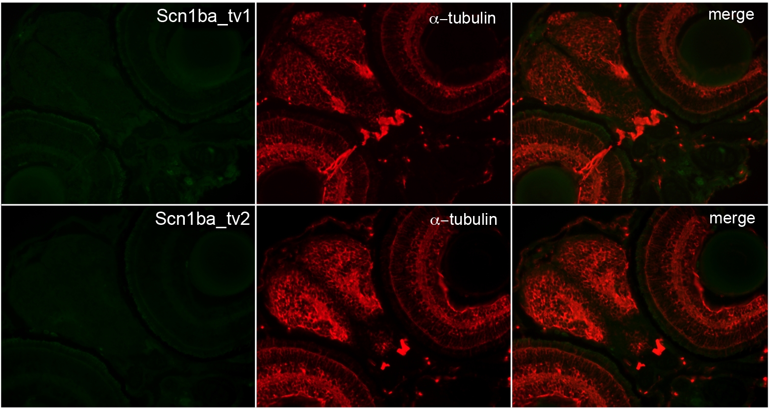 Fig. S1 Antibody characterization. Immunohistochemical analysis of anti-Scn1ba_tv1 (top panel) or anti-Scn1ba_tv2 (lower panel) antibody (green) staining following pre-adsorption to its corresponding antigenic peptide. Sections were co-stained with anti-acetylated α-tubulin (red). Merged panels on the right.