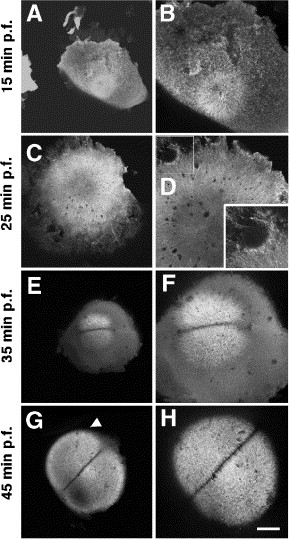 Fig. 4 Microtubule asters emanate from the center of the embryo during the early cellular cycles. Animal views of embryos fixed at progressively older stages of development (A, B: 15 min p.f.; C, D: 25 min. p.f.; E, F: 35 min p.f.; G, H: 45 min p.f.) and labeled with an anti-α-tubulin antibody. Left column: overview; right column, higher magnification views. The insert in panel D shows a higher magnification of the region labeled with a square. (A, B) Immediately after fertilization, a monoastral structure forms at the animal pole of the blastodisc. (C, D) Microtubules of this monoaster increase in length and reach the periphery of the blastodisc, which also exhibits local accumulations of shorter microtubules (inset). (E, F) Immediately prior to the first cleavage, a diastral structure flanking the prospective furrow. (G, H) As in the previous cycle, microtubules of this diaster increase to occupy more peripheral regions of the blastodisc. Scale bar in panel (H) represents 200 μm (left column) and 100 μm (right column).