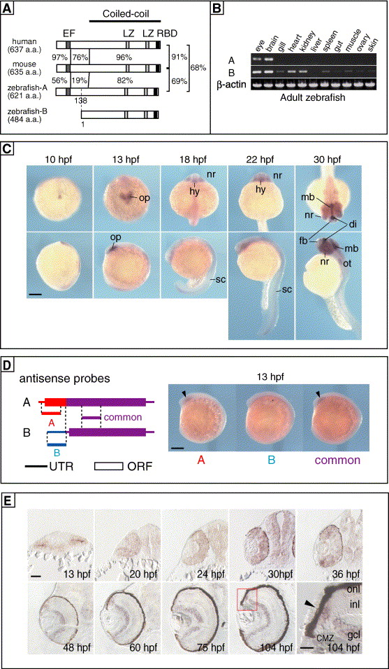 Fig. 1 Cloning and characterization of zebrafish Rab11-FIP4. (A) Schematic representation of protein structures of Rab11-FIP4 orthologues. The numbers indicate percentages of identical amino acids between any 2 proteins. Conserved motifs are indicated as boxes. EF, EF-hand; LZ, leucine-zipper-like motif; RBD, Rab11-binding domain. The predicted coiled-coil region is indicated at the top. A putative zRab11-FIP4B protein was predicted from its nucleotide sequence to be translated from Met138 of the A-form. (B) Expression of zRab11-FIP4 isoforms in various tissues of adult zebrafish was examined by semi-quantitative RT-PCR. β-actin was used as a control. (C) Expression of zRab11-FIP4 in developing zebrafish embryos. Whole-mount in situ hybridization was performed by using RNA prepared from full-length cDNA of zRab11-FIP4A as a probe. di, diencephalon; fb, forebrain; hy, hypothalamus; mb, midbrain; nr, neural retina; op, optic vesicle; ot, otic vesicle; sc, spinal cord. Scale bar indicates 200 μm. (D) Expression of A and B isoforms of zRab11-FIP4. Positions of antisense probes specific for each transcript (A and B) and common for both (common) along cDNAs are illustrated (left). The length of each probe was about 300 bases. In situ hybridization was performed by using 13-hpf embryos (right). Expression in the optic pit was pointed by arrowhead. (E) Expression of zRab11-FIP4 in the developing retina. In situ hybridization of transverse sections of embryonic heads was performed by using the same probe described above. The boxed area around the CMZ (104 hpf) is shown at higher magnification in the lower right most panel. Arrowhead indicates zRab11-FIP4 expressed in the CMZ. CMZ, ciliary marginal zone; gcl, retinal ganglion cell layer; inl, inner nuclear layer; onl, outer nuclear layer. Scale bars indicate 50 μm except in the lower right most panel, where the scale bar indicates 20 μm.