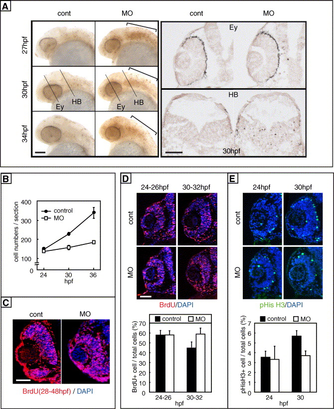 Fig. 3 Impaired proliferation of retinal progenitors in zRab11-FIP4 morphants. (A) Cell death in the MO-injected embryos. Embryos injected with either control-MO (left column) or zRab11-FIP4-MO1 (right column) were subjected to the TUNEL assay using whole embryos (left panel) and tissue sections (right panel). (Left panel) Embryos fixed at 27, 30 and 34 hpf were analyzed. Excess cell death in the hindbrain region of the morphants is marked with brackets. (Right panel) Transverse sections prepared from control and the morphants at 30 hpf were analyzed. Sections at the levels of the eye (Ey) and hindbrain (HB) were used, and the positions are indicated in the left panel. (B) Increase in the retinal cell number during development as estimated by counting the cells in tissue sections. The cell number/retinal section at each time was calculated as the average of numbers scored from at least 17 (control, closed circles) or 23 (zRab11-FIP4 morphants, open squares) sections prepared from 4 to 5 embryos. Standard deviations are indicated as error bars. The differences are statistically significant at 30 and 36 hpf (P < 0.001 in each case) but not at 24 hpf (P > 0.1). (C) Proliferating cells in the retina were examined by a long-term incorporation of BrdU from 28 to 48 hpf. (D) Retinal cells in the S-phase were labeled by short-term (2 h) BrdU incorporation starting at either 24 or 30 hpf. (Upper panel) Transverse sections were immunostained with the anti-BrdU antibody. (Lower panel) The number of BrdU+ cells was counted, and the ratio to total cells was scored. Standard deviations are indicated as error bars. (E) Mitotic cells in the retina were immunostained with an anti-phospho-histone H3 antibody. (Upper panel) Immunostained mitotic cells in transverse sections are seen. (Lower panel) Ratios of mitotic cells (pHisH3+) to total cells in retinal sections of 24- and 30-hpf embryos were scored. In panels D and E, the differences between control and zRab11-FIP4 morphants are statistically significant at 30 hpf (BrdU; P = 0.01, pHisH3; P = 0.008) but not at 24 hpf (BrdU; P = 0.86, pHisH3; P = 0.75). Scale bars indicate 50 μm.