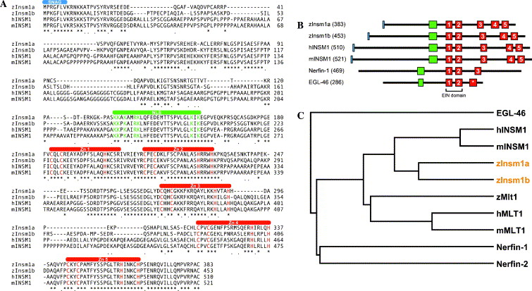 Fig. 1 Comparison of zebrafish Insm1a and Insm1b to mammalian and invertebrate homologues. (A) Amino acid alignment of predicted zebrafish Insm1a (AAZ94623) and Insm1b (AAZ94624) to human (NP_002187) and mouse (NP_058585) INSM1. Amino acid identity (asterisks) and similarity (periods) are indicated below the aligned sequences. Insm1 is predicted to contain an amino-terminal SNAG motif (blue), a putative nuclear localization sequence (green), and five (numbered) carboxy-terminal Cys2-His2 zinc fingers (red). Zinc coordination residues of each zinc finger are highlighted in red. (B) Protein schematic showing the predicted domain structure of Insm1, Nerfin-1, and EGL-46 proteins. Shown are the amino-terminal SNAG repressor domains (blue), putative nuclear localization signals (green) and carboxy-terminal Cys2-His2 zinc fingers (red). Proteins were drawn to scale and aligned about the highly conserved EIN domain. Zinc fingers are numbered based on homology as in (A) and indicated in invertebrate homologues. Zinc finger 3 of EGL-46 (asterisk) does not share the conservation seen in other EIN homologues. Numbers in brackets indicate the amino acid length. (C) Phylogenetic analysis showing zebrafish Insm1a and Insm1b (highlighted in orange) are more similar to mammalian INSM1 than to another INSM1-like protein, MLT1. We have identified a zebrafish MLT1-like gene from genomic sequences that is more similar to mammalian MLT1 than to INSM1. z, zebrafish; h, human; and m, mouse.