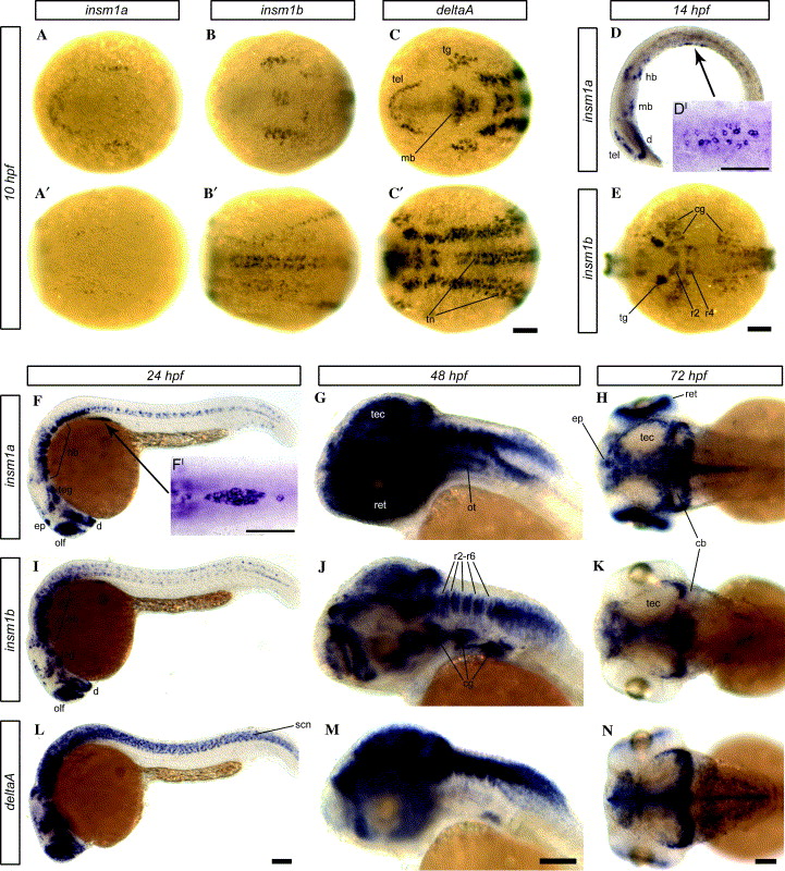 Fig. 3 Embryonic expression patterns of insm1a (A, A′, D, D′, F, F′, G, and H) and insm1b (B, B′, E, I, J, and K). At 10 hpf (A, A′, B, B′, C, and C′) shortly after neurogenesis has been initiated, insm1a is barely detectable in the lateral trunk while insm1b is expressed in a broader range of presumptive trunk neurons, as shown by similarities to expression of the proneural gene deltaA (C, C′, L, M, and N). (A–C) Anterior expression while A′, B′, and C′ show trunk expression of the same embryo. At 14 hpf (D, D′, and E) insm1a is visible in a disorganized manner in the rostral trunk region (inset D′), presumably pancreatic progenitors. insm1b is clearly visible in the presumptive trigeminal ganglia (E). By 24 hpf (F, F′, I, and L) it is evident that both insm1a and insm1b are expressed in a subset of proneural, deltaA-positive cells. Ventral endoderm in the rostral trunk shows a clustering of cells expressing insm1a (inset F′). At 48 hpf (G, J, and M) both insm1a and insm1b are visible throughout the CNS and expression in the spinal cord is no longer detectable. Expression is also seen as dorsoventral stripes in the hindbrain. Retinal expression of insm1a is prevalent at 48 hpf, however by 72 hpf (H, K, and N) it is restricted to a subset of cells, consistent with a transient process such as neuronal differentiation or maturation. Scale bars represent 100 μm. Inset images were taken of flat mounts of the same embryo shown in its respective panel. cb, cerebellum; cg, cranial ganglia; d, diencephalon; ep, epiphysis; hb, hindbrain; mb, midbrain; olf, olfactory placode; ot, otic vesicle; r, rhombomere; ret, retina; scn, spinal cord neurons; tec, optic tectum; teg, tegmentum; tel, telencephalon; tg, trigeminal ganglia; and tn, trunk neurons.