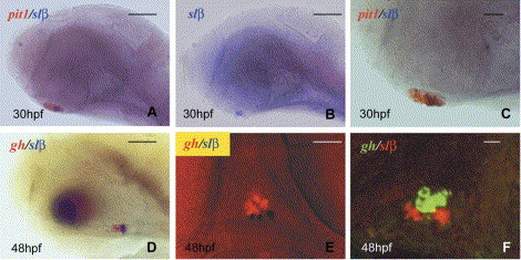 Fig. 2 Slβ expression pattern during embryogenesis. WT zebrafish embryos at 30 hpf (A–C) and 48 hpf (D–F). (A–D) Lateral view, anterior to the left. (E,F) ventral view, anterior to the top. Scale bars represent 40 μm. (A–C) Slβ is expressed in several cells also expressing pit1. The blue label corresponds to slβ, red to pit1. (B) same emryo as in (A) after the red label was washed out. (D–F) Gh and slβ are expressed in different cells. (D,E) slβ label is in blue and Gh was revealed by using Fast Red, for visualization by classical microscopy (D) and by fluorescence (E). Gh (in red) is expressed anterior to slβ (in blue) (F) The same embryos were analyzed by combined fluorescent in situ hybridization: red fluorescence for slβ and green for gh. Gh-expressing cells are clearly anterior to slβ-expressing ones.