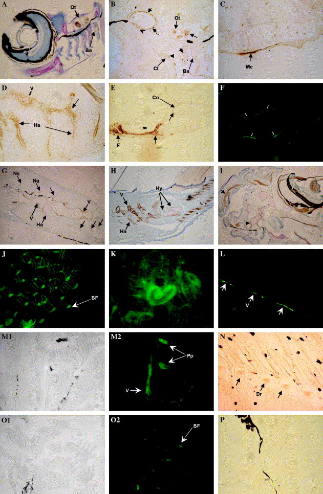 Fig. 4 Immunohistochemical and immunofluorescent detection of Bgp accumulation at different developmental stages. (A–K) Bgp in zebrafish. (A) Accumulation of Bgp in the teeth of branchial arch 5 (Ba) and otolith (Ot) of a 8 dpf larva (200×); counterstaining with toluidine blue. (9B) Accumulation of Bgp in the teeth of branchial arch 5, otolith and cleithrum of a 9 dpf larva (400×). (C) Accumulation of Bgp in Meckel’s cartilage of a 13 dpf larva (1000×). (D) Accumulation of Bgp is first detected in calcifying vertebra and hemal arches at 13 dpf (1000×). (E) Accumulation of Bgp in the calcifying pectoral fin (F) and coraco–scapular complex (Co) at 20 dpf (400×). Notice the accumulation at the periphery of the coracoid undergoing perichondral mineralization. (F) Immunofluorescent detection of Bgp accumulation in the mineralizing urostile at 20 dpf (400×). (G) Accumulation of Bgp in the vertebral column (V), neural arches (Na), neural spines (Ns), and hemal arches (Ha) at 20 dpf (200×). (H) Bgp accumulation in the vertebral column, hemal arches, and in the mineralizing matrix of hypural plates (Hy) of the caudal fin and in the mineralized fin rays of a 31 dpf juvenile (100×). (I) Accumulation of Bgp in a juvenile is detected in all the bones and calcifying cartilages of the head region, e.g., supramaxillary (arrow) and associated bones, the ethmoid plate (arrowhead), and the supra orbital cartilage that surrounds the eye (100×). (J) Accumulation of Bgp is widely detected by immunofluorescence in the branchial arches of a juvenile (200×). (K) Bgp accumulation in epithelial cells from some renal tubules of the kidney in juveniles (400×). (L–P) Bgp in sole. L-Immunofluorescent detection of Bgp in the forming vertebra (arrows) surrounding the notochord of a 15 dpf larvae (400×). (M) Detection of Bgp accumulation in the vertebra and parapophysis (Pp) at 25 dpf (M1 bright field and M2 dark field) (250×). (N) Accumulation of Bgp in the calcifying distal radials (Dr) at 25 dpf. (O0 Bgp is strongly detected in the calcified branchial arches of a 41 dpf juvenile (O1 bright field and O2 dark field) (250×). (P) Control immunohistochemical detection with pre-immune serum lacks staining, shown here in cranial bones of a 20 dpf larvae.
