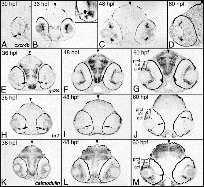 Fig. 1 Transcripts predominantly expressed in the GCL. Shown are examples of cDNAs expressed in the ganglion cell layer. (A–D) Expression of cxcr4b between 30 and 60 hpf. (E–G) Expression of the gc34 gene between 36 and 60 hpf. (H–J) Expression of hrT between 36 and 60 hpf. (K–M) Expression of the calmodulin gene between 36 and 60 hpf. Expression was studied on plastic sections following whole-embryo in situ hybridization. Arrowheads mark the midline. Arrows indicate individual cells or small groups of cells that feature expression of particular transcripts. hpf, hours postfertilization; prcl, photoreceptor cell layer; inl, inner nuclear layer; gcl, ganglion cell layer.