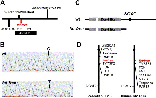 Fig. 3 Positional cloning of the zebrafish ffr locus A) Schematic of the ffr locus. Marker fc83b07 is 0.06 cM from the ffr locus (1 recombinant out of 1732 meioses). A radiolabeled probe synthesized from fc83b07 identified five BAC clones. Mapping using the end sequences of these BAC clones indicated that clone dK56F11 spanned the entire ffr locus. B) A single nucleotide mutation (C to T) that results in a premature stop codon was identified in ffr mutants (0 recombinants > 2000 meioses) within a predicted open reading of dK56F11. C) Domain analysis indicates that Ffr has a Dor-1 like domain, a tyrosine phosphorylation site (Tyr-P), and a SGXG motif. The truncated mutant protein is predicted to be approximately half the length of wild-type Ffr. D) ffr is located on zebrafish chromosome 10 in a region syntenic to a region of human chromosome 11q13.