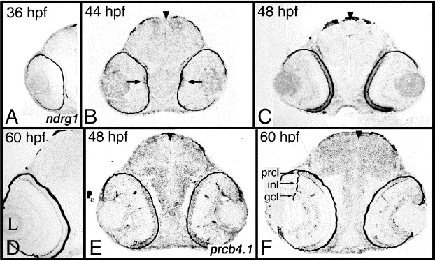 Fig. 3 Transcripts predominantly expressed in the photoreceptor cell layer. (A–D) Expression of ndrg1 between 36 and 60 hpf. (E–F) Expression of prcb4.1 at 48 and 60 hpf. Expression was studied on plastic sections following whole-embryo in situ hybridization. Arrowheads mark the midline. hpf, hours postfertilization; prcl, photoreceptor cell layer; inl, inner nuclear layer; gcl, ganglion cell layer.
