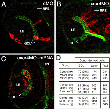 Fig. 7 Mosaic analysis of cxcr4b knockdown phenotype. Blastomeres were transplanted into untreated host embryos from sibling donor embryos that were injected with a control MO (A) an anti-cxcr4b MO (B) or a mixture of anti-cxcr4b MO and crcr4b mRNA. The resulting mosaic retinae contain a mix of morpholino-treated donor-derived cells (red) and untreated host cells. The ganglion cell layer (GCL, green) is visualized with the Zn8 antibody. (D) The frequency of GCL cells in clones derived from donor animals treated with a control MO, anti-cxcr4b translation blocking MO (MO#1), anti-cxcr4b splice-site blocking MO (MO#2), or anti MO#1 and cxcr4b mRNA (Rescue). Each row of panel D table shows a separate experiment. In all experiments, morpholino injection resulted in a statistically significant loss of ganglion cells. mRNA treatment restores the wild-type frequency of ganglion cells. The numbers of retinae examined are provided in brackets. GCL, ganglion cell layer; LE, lens; RPE, retinal pigmented epithelium.