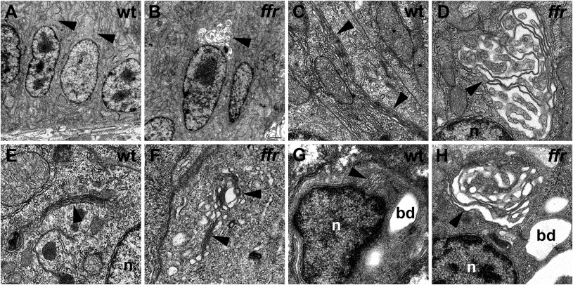 Fig. 2 Ultrastructural analyses reveal abnormal Golgi apparatus in the ffr mutants A–D) Transmission electron micrographs show that intestinal Golgi architecture is disrupted in in 5 dpf ffr mutant larvae (B and D) compared to wild-type larvae (A and C). E–H) Golgi morphology is also disrupted in the 5 dpf ffr exocrine pancreas (F) and biliary cells (H), compared with wild-type (E and G) (5 dpf). n, nucleus; bd, bile duct lumen; arrowheads point to Golgi in all panels.