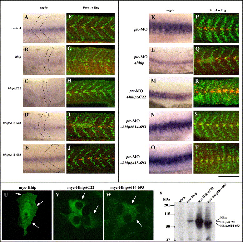 Fig. S3 hhipΔC22 fails to suppress the phenotype of ptc-MO-injected embryos. (A–J) eng1a and Eng protein expressions are reduced in hhipΔC22-injected embryos. (A–E) Expression of eng1a. (F–J) Embryos double labeled with anti-Prox1 and 4D9. Embryos injected with hhip, hhipΔC22 and hhipΔ614–693 exhibit decreased eng1a, Prox1 and 4D9 double labeled muscle pioneer cells (B, C, D, G, H, I) and U-type somites (B, C, D, dotted line). There is no obvious difference in eng1a expression between control and hhipΔ415–693-injected embryos. (K–T) Hhip lacking the membrane anchoring domain fails to restore the phenotypes of ptc-MO-injected embryos. (K–O) Expression of eng1a. (P–T) Embryos double labeled with anti-Prox1 and 4D9. hhip suppresses ectopically induced eng1a in ptc-MO-injected embryos (L, Q). In contrast, hhipΔC22 fails to suppress ectopically induced eng1a expression (M, R). Side views, anterior to the left, dorsal to the top, 24 hpf, scale bar: A–T, 100 μm. (U–W) HhipΔC22 fails to localize to the cell surface. COS7 cells transfected with myc-tagged Hhip and then labeled with anti-myc antibody. Hhip protein is detected at the cell surface (U, arrows), whereas HhipΔC22 and HhipΔ614–693 proteins are not located on the cell surface (V, W, arrows). (X) Western blot analysis of Hhip protein. COS7 cells transfected with myc-tagged Hhip and then labeled with anti-myc antibody.