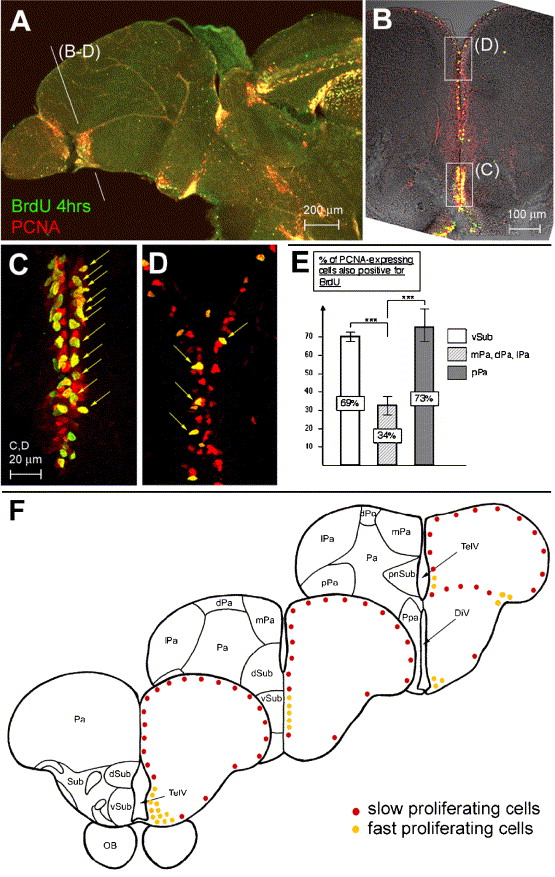 Fig. 2 Different cell cycle characteristics between proliferation zones in the adult zebrafish telencephalon. (A–D) Double immunolabeling for PCNA (red) and BrdU (green) on sagital (A, anterior left) and cross (panels B–D, dorsal up) vibratome sections observed under confocal microscopy; panels C, D are the areas boxed in panel B observed at higher magnification and on an optic section of 1.5 μm. PCNA expression and BrdU-positive cells are concentrated ventrally (compare the density of PCNA-only (red) and double-labeled (yellow arrows) cells in B–D). (E) Labeling index (number of PCNA-positive cells that are also BrdU-positive) in the telencephalon along the DV axis. In the anterior telencephalon: 69% in the ventral subpallium, n = 115 PCNA-positive cells counted, against 33.7% in the dorsal subpallium, medial, dorsal, and lateral pallium, n = 327; at the surface of the posterior pallium: 73%, n = 26. (F) Schematic representation of the zones of fast (yellow dots) and slow (red dots) proliferation in the zebrafish adult telencephalon, as identified in panels A–E. Cross-sections are oriented along the AP axis. Abbreviations: see Fig. 1, and DiV: diencephalic ventricle, dPa: dorsal pallium, dSub: dorsal subpallium, lPa: lateral pallium, mPa: medial pallium, pnSub: postcommisural nucleus of the ventral subpallium, Ppa: preoptic nucleus, pPa: posterior pallium, TelV: telencephalic ventricle, vSub: ventral subpallium.